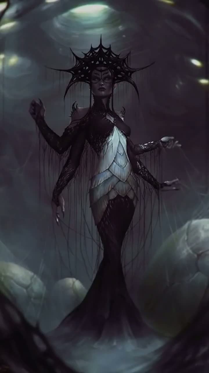 dark fantasy atmospheric gothic, seductive female vocals with whispering layered harmonies, eerie strings and harp, subtle electronic pulses, sinister choir in background, slow brooding tempo building to intense climax, inspired by darksynth, witch house, and cinematic horror soundtrack, spiderweb intrigue vibe, mysterious and venomous