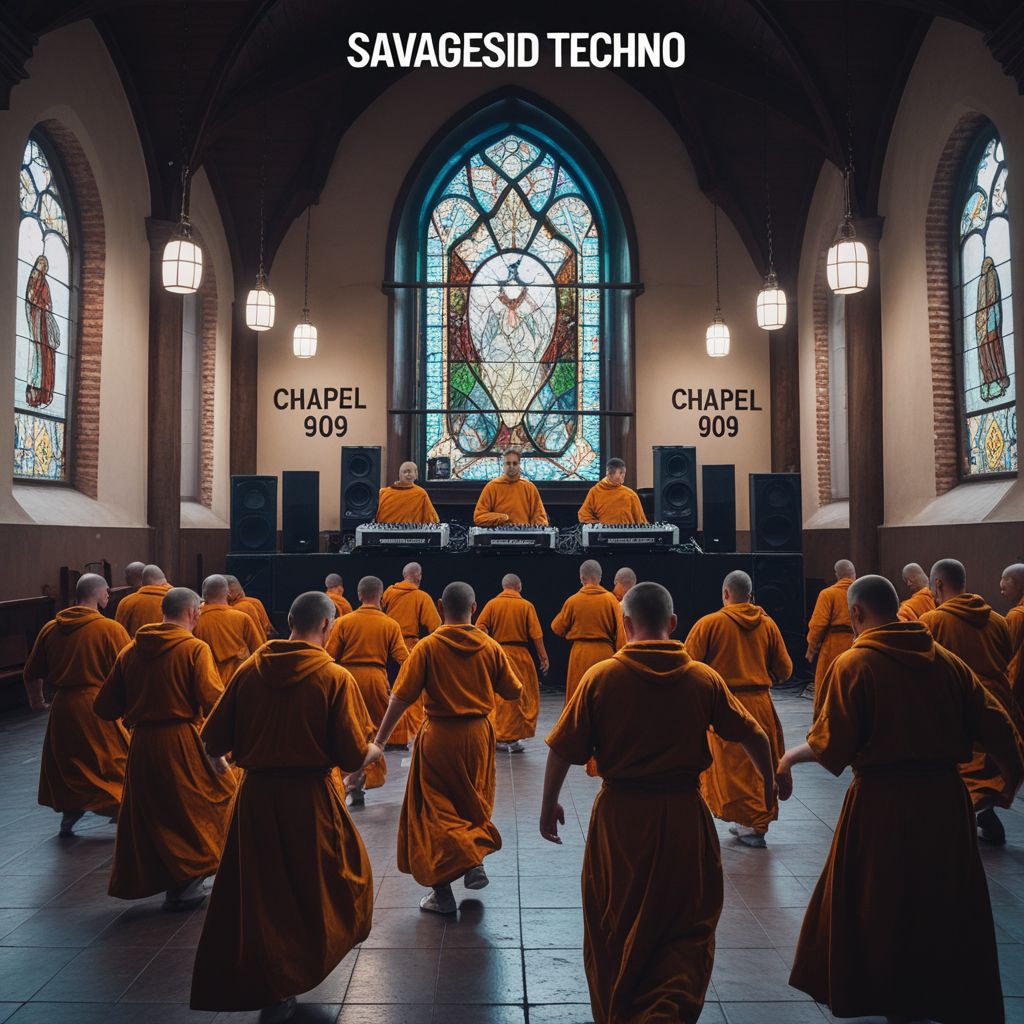 6-7 minute, 145-150bpm dark acid techno track with pounding/stomping 909 kick or a pounding Dubstep kickdrum with slight distortion, rolling hi-hats, distorted pitching raw 303 acid bassline, gothic style chants (ahhh, ohhh, wordless soft ethereal vocal tones), Cathedral reverb on the chants, layered with eerie drones, Build and release structure: long intro with drones and chants, drop into heavy pitching acid groove, breakdown with only chants + acid line, then climax with full pounding acid techno, No lyrics, only chant-like sounds