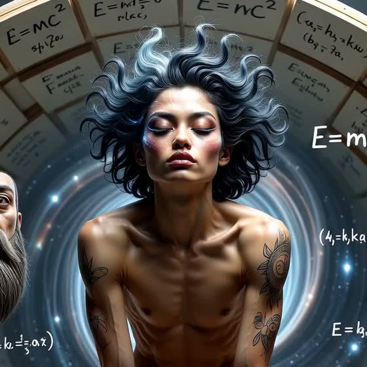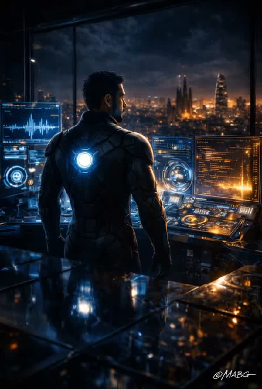 Cinematic dark progressive house fused with experimental AI sound design, tempo 122–126 BPM with dynamic tempo shifts, deep sub bass, analog distortion layers, evolving granular synthesis textures, glitch modulation, spectral morphing pads, complex polyrhythmic percussion, hybrid orchestral + electronic scoring, tension-driven structure, Arkham-inspired atmosphere, male deep narrative voice (Batman-like), AI female alien diva vocal textures (non-human, harmonic overtones), whispered layers, aggressive drop design with unexpected silence breaks, ritual tribal section with low drums and distorted chants, hyper-detailed stereo imaging, cinematic transitions, evolving arrangement complexity, immersive and unpredictable, studio quality sound, MABG Style signature ©