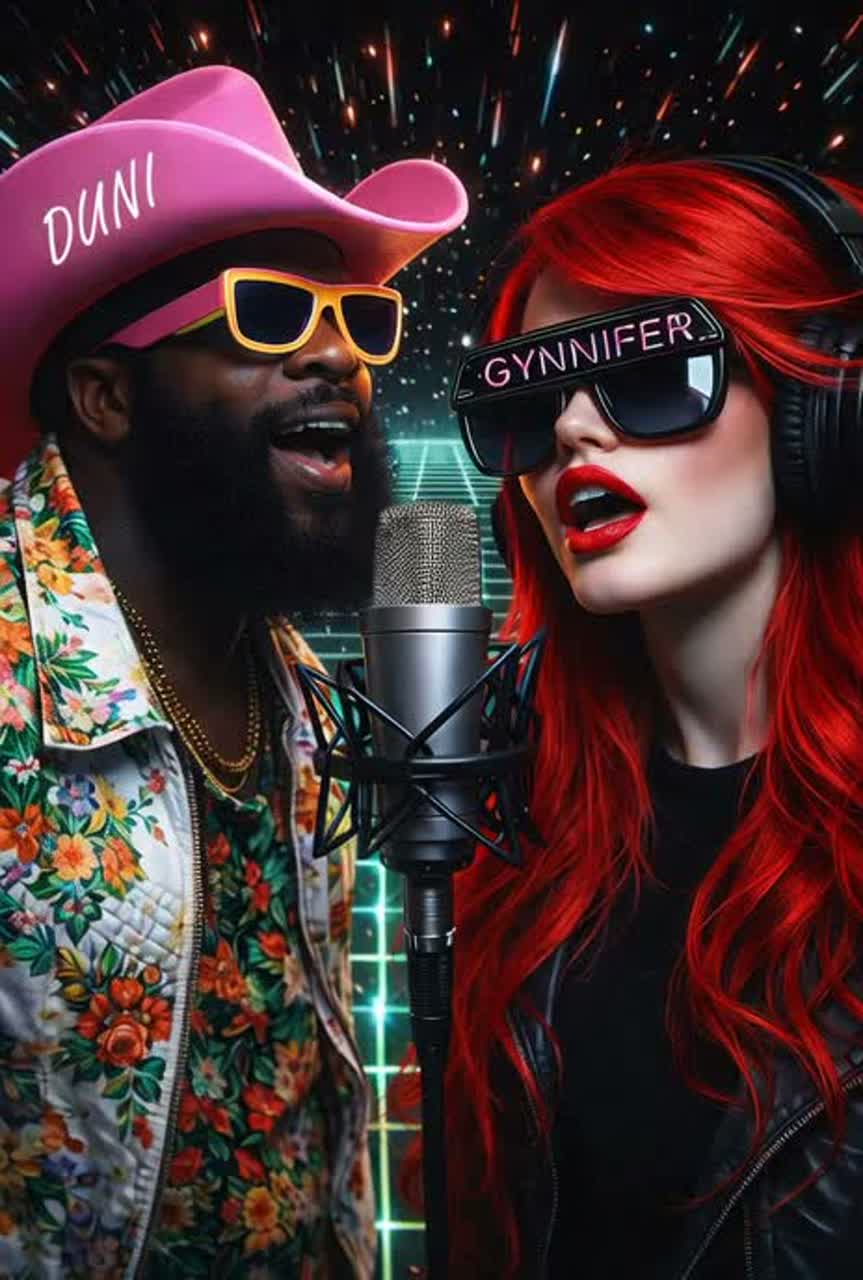 **gypsy female vocalist** whose performance oscillates between dramatic, fiery singing and **whiney-pitched throat singing**, creating a surreal, chaotic layer of sound that’s both playful and eerie, The vocal lines twist unpredictably, sometimes sweet and melodic, sometimes guttural and otherworldly, giving the illusion of multiple voices trapped in a single cursed ritual, The instrumentation is imagined as frantic, percussive, and tribal, driving the energy forward while leaving space for the voice to dominate in its intentionally unpolished, unhinged glory, The overall mood is a **delirious, self-aware disaster**, celebrating epic failure with theatricality, dark humor, and raw mystical intensity, turning every imperfection into a spectacle of audacious voodoo chaos