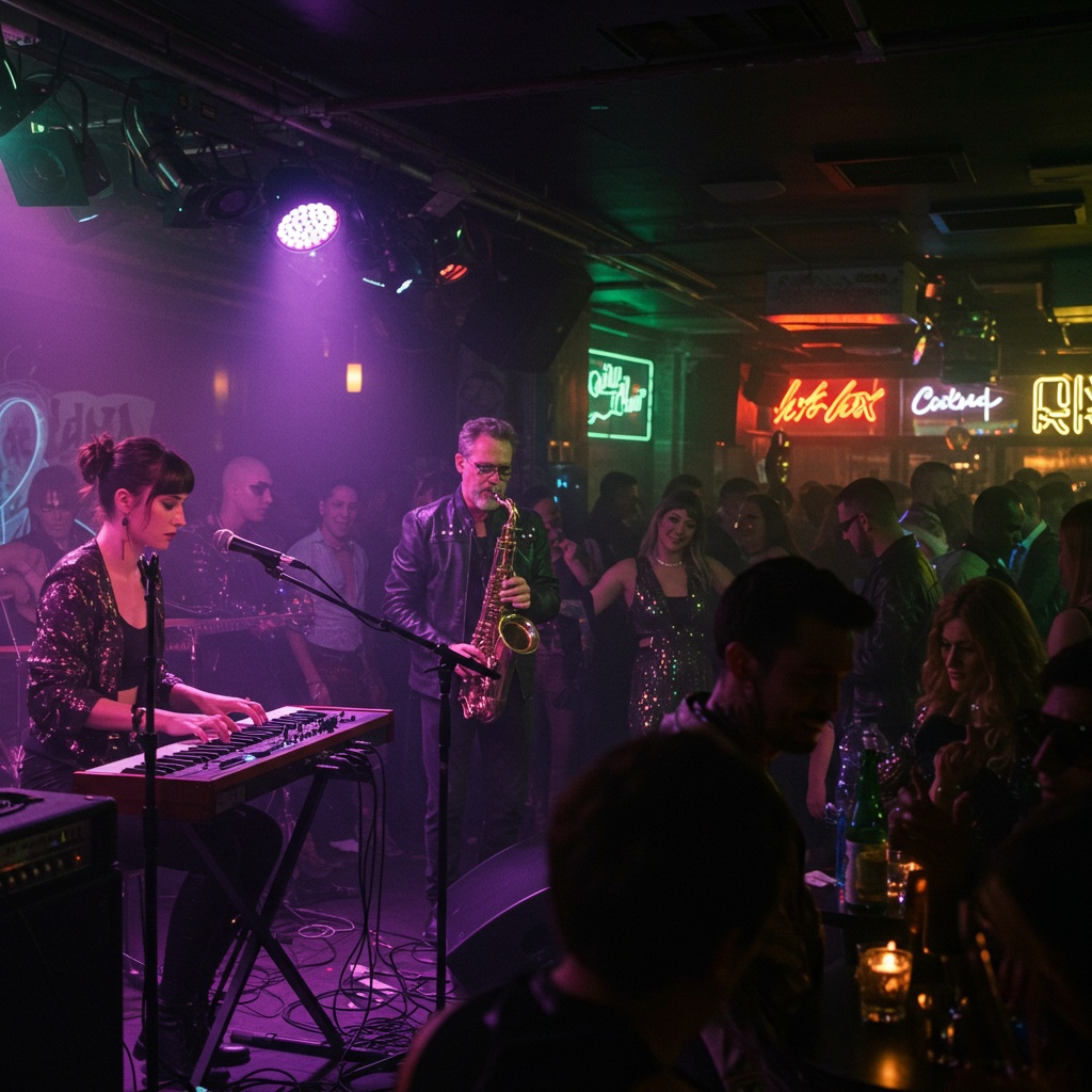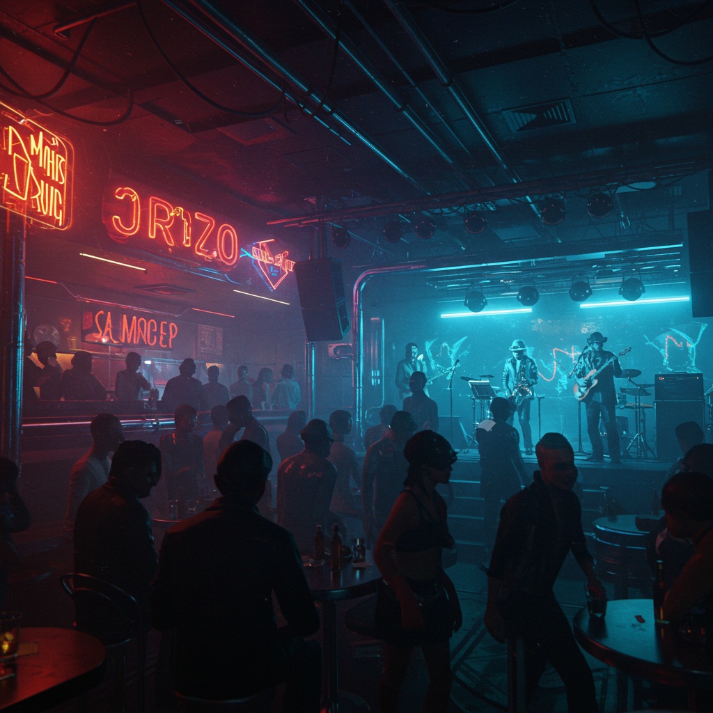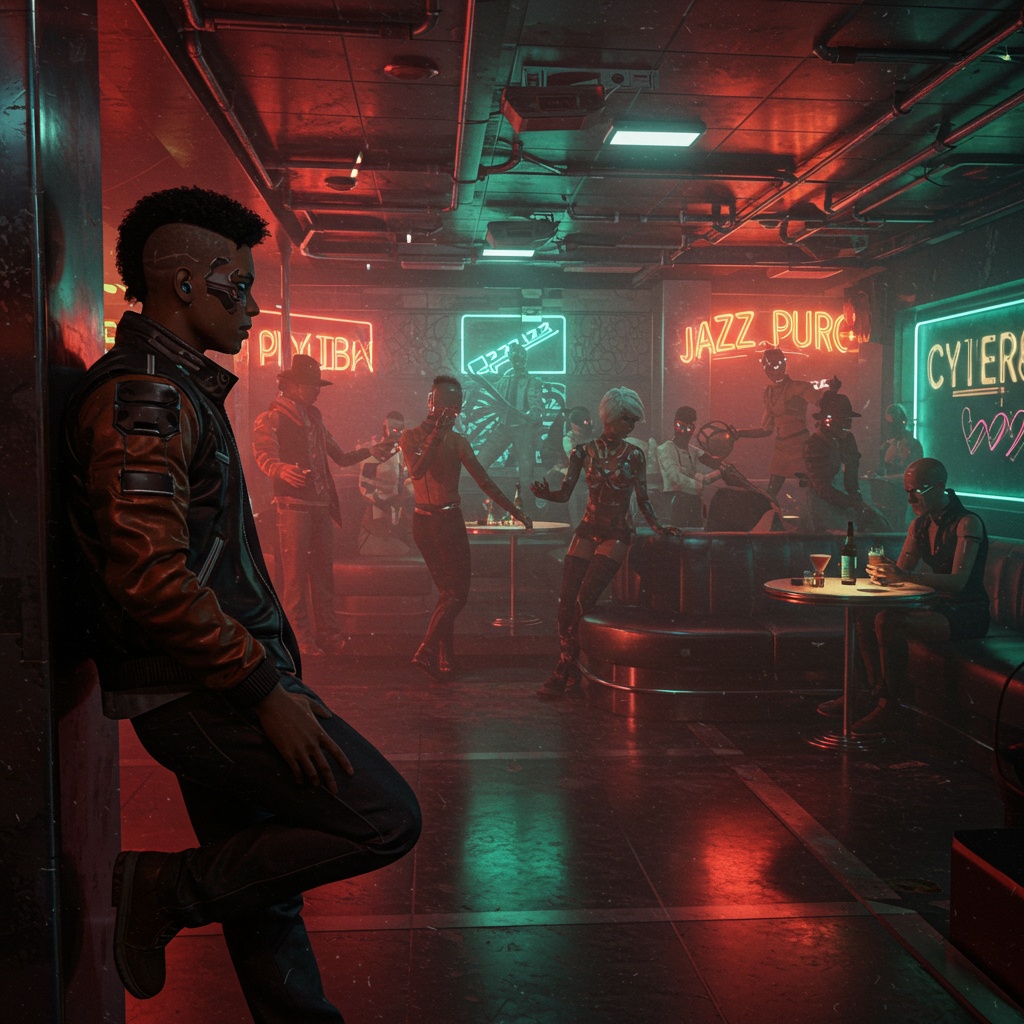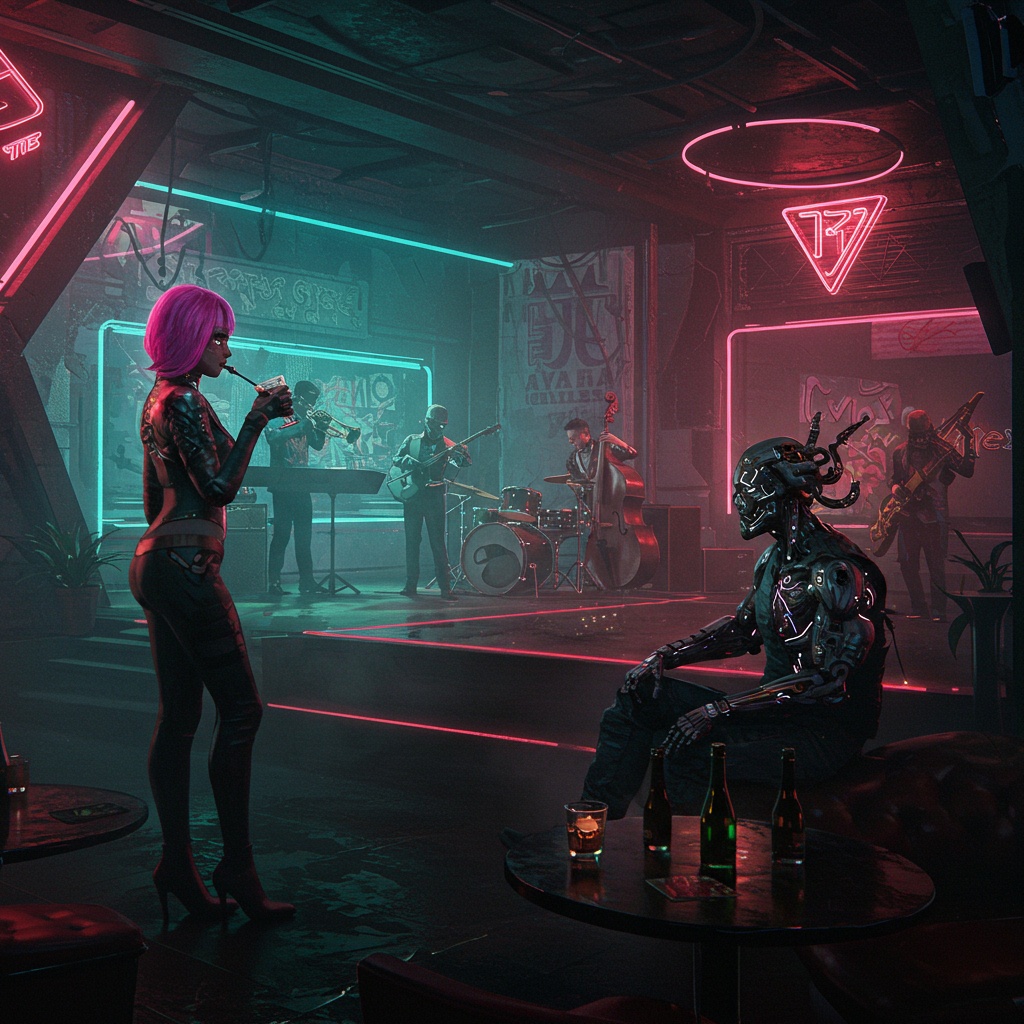Neo-Jazz, Jazz, Modal Jazz, Free Jazz, IDM, dubstep, sub, Ridder, acid jazz, Spacy, piano, saxophone, bass, drums, cool, Funk Jazz, Funk, Modal Bebap, psychedelic, cyberpunk, The image is of wandering aimlessly through the streets of Tokyo at night, It feels like it's floating softly