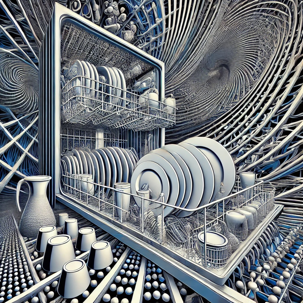 Minimal house beat, groovy funky bass, space disco x funky house beat, minimal jazz piano licks, subtle Chiptune influences, the dishwasher is filled with unerring efficiency space saving melody
