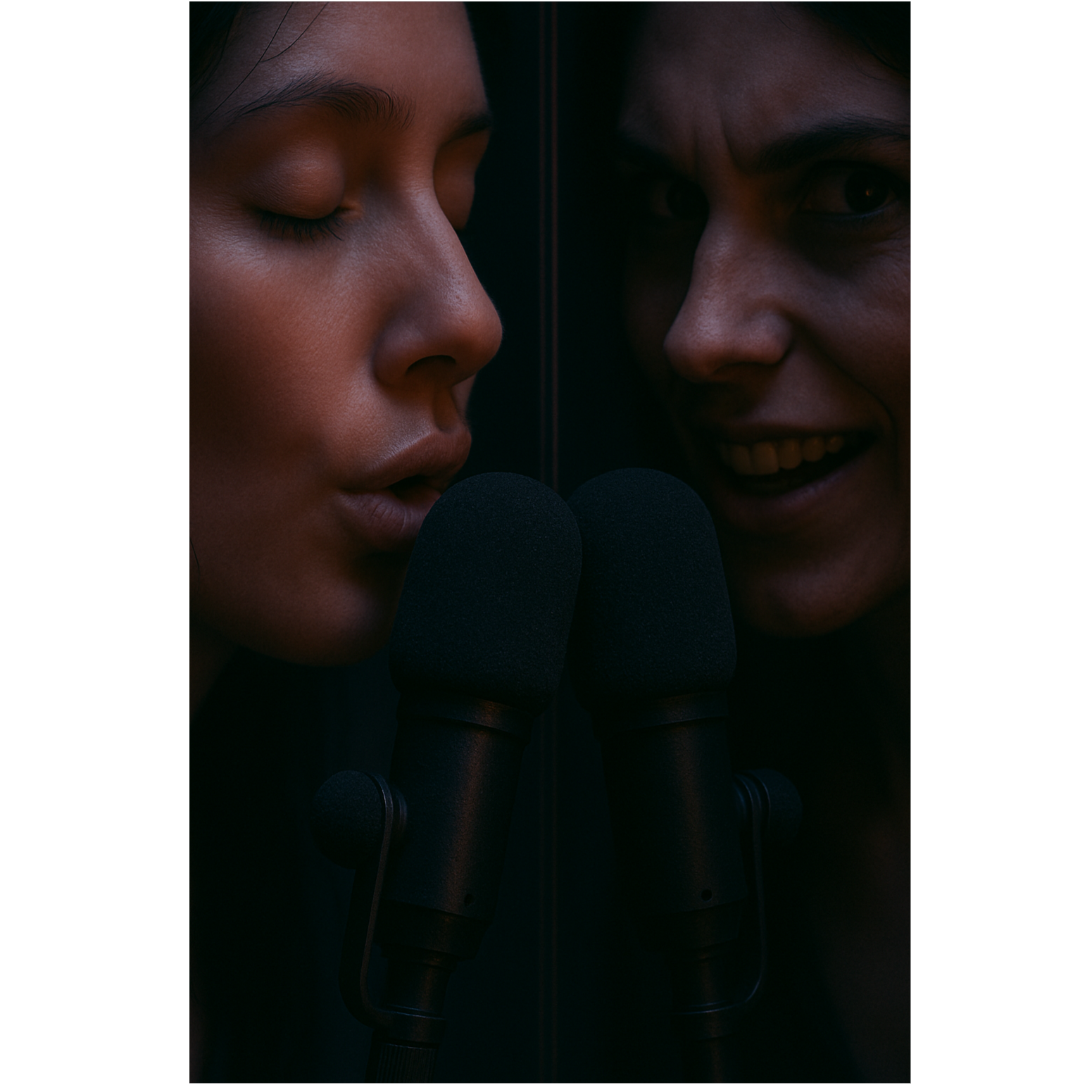 A slow, hypnotic track with pulsing, breath-heavy textures; layered wet ASMR sounds glide between close-mic’d syllables, Sparse, Dual whispers—one sweet, one twisted—coo, hum, and overlap, creating nurturance laced with unease