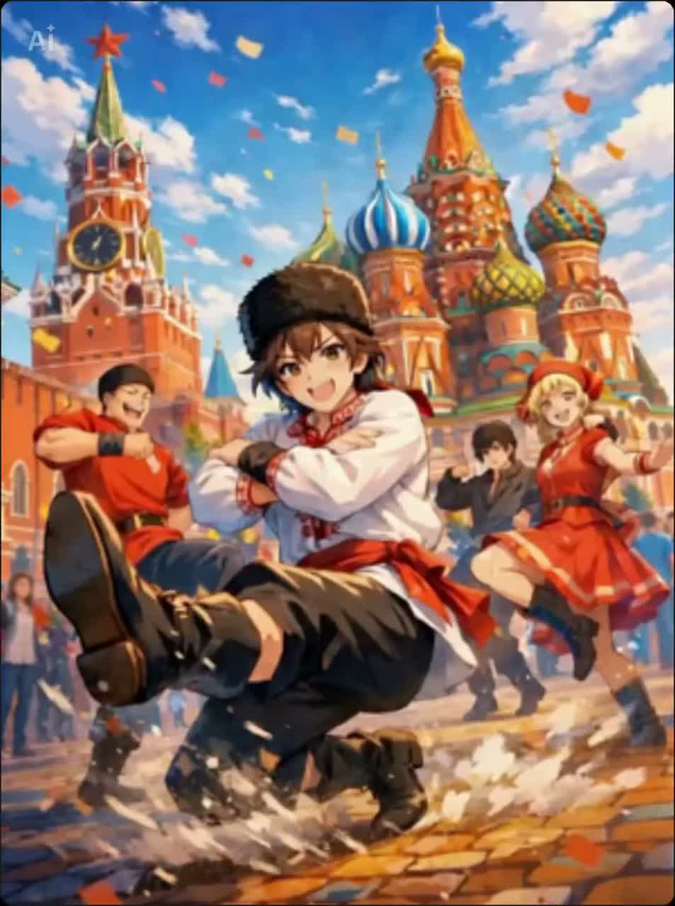 High-energy Russian folk dance music, Cossack style, Fast tempo around 150–170 BPM, driving rhythm, Strong male chorus, deep powerful voices, Call-and-response chant sections, energetic shouts (hey!), Rhythmic stomping sounds, foot tapping and knee slapping, Heavy accents on beats, percussive body rhythm, Balalaika and accordion lead melodies, Fast, playful yet intense melodic lines, Sudden dynamic shifts: