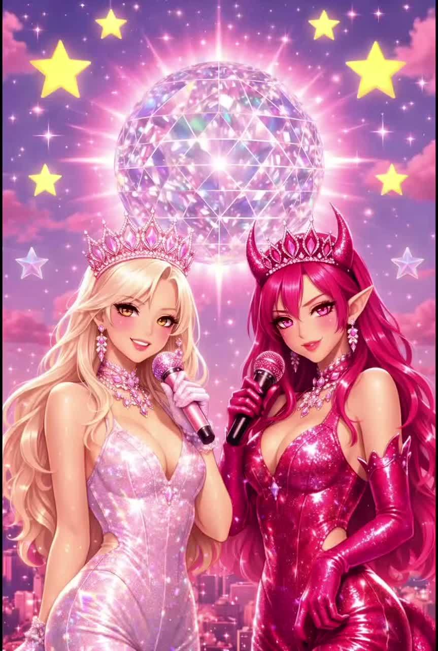 Full-scale live spectacular, hybrid concert + broadcast special with announcer moments, crowd chants, character trade-offs, Times Square energy meets Broadway fantasy, Broadway scale, anime OST drama, pop-rock power, witch-house darkness, High-energy Pop Diva Anthem with Pop-Rock, Glam Pop, Glam Rock, Pop-Punk, Symphonic Pop, Broadway Musical, Witch House Pop, Witch House Rap, Gothic Trap, and EDM elements, Features two alternating female lead vocalists: Erica Heaven (ethereal, powerful, emotional pop soprano with bright, uplifting tone) and Pink Devil (theatrical, mischievous, darker mezzo-soprano with confident rap-pop and dramatic delivery), Live crowd atmosphere throughout: cheering, chanting, clapping, countdown shouts, and festival energy similar to a Times Square New Yearâs Eve broadcast, Modern studio-quality sound with cinematic polish: Dolby Atmos-style wide soundstage, immersive stereo, enhanced clarity, powerful, dramatic builds, & explosive drops, Live performance SFX