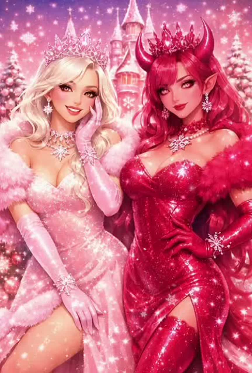 Christmas ⢠Christmas Pop ⢠Christmas Theatrical Pop ⢠Christmas Musical ⢠Christmas Broadway ⢠Christmas Spectacular ⢠Classic Christmas ⢠Christmas Carol ⢠Christmas Symphonic ⢠Christmas Orchestral ⢠Holiday Contemporary ⢠Adult Contemporary ⢠Satirical Christmas ⢠Comedic Christmas ⢠Dark Fantasy Christmas ⢠Magical Girl Anime Christmas ⢠Anime OST ⢠Winter Dreamscape ⢠Fantasy Pop, Catchy ⢠Upbeat ⢠Fun ⢠Funny ⢠Playful ⢠Seductive ⢠Naughty ⢠Bright & Jolly ⢠Dark & Alluring ⢠Bombastic ⢠Anthemic ⢠Dancey ⢠Sing-along ⢠Glam ⢠Pink & Sparkly ⢠Magical ⢠Cinematic ⢠Dramatic ⢠Replay-worthy Christmas Classic, Magic FX ⢠Snow FX ⢠Twinkle FX ⢠Sparkle risers ⢠Reversed bells ⢠Whisper FX ⢠Fantasia-style ambience, Enhanced Audio ⢠Clean studio quality ⢠Mastered ⢠Dolby Atmos feel ⢠Stereo widened ⢠THX cinematic depth ⢠Shimmering highs ⢠Immersive soundstage, Female Duet of Heaven (Female Nice) and Pink Devil (Female Naughty)