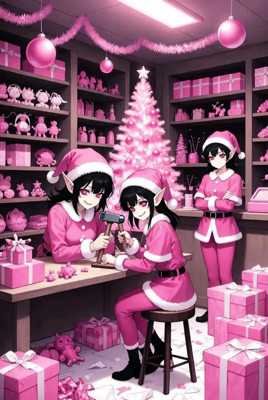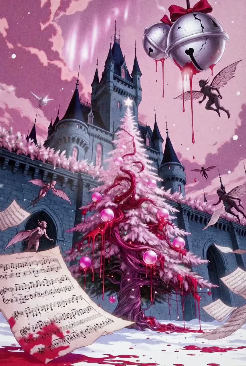Creepy spooky Christmas, pink Devil Santaâs workshop at the north pole, Christmas, traditional Christmas, classic Christmas, novelty Christmas, Bell chimes, sleigh bells, starts sounding fun and cheery like bright Christmas elves at Santaâs castle working in the workshop making toys, but turns dark and evil, Toy tinkering fx, Christmas villain, Evil Christmas, Dark Christmas, Dark fantasy, Christmas elves horror, Occasional chants of âHo-ho-horror!â And maniacal laughter âHahahaha!â Christmas organs, Christmas symphonic, Christmas orchestral, Christmas theatrical, Gothic symphonic, Punk-pop symphonic, Twisted Christmas at the north pole with wicked elves, sounds of gears Turing, elves building toys, toy solders marching, springs bouncing, tiny hammers hammering, levers being pulled, sounds of gift wrap and bows being tied, haunting chimes, Snow fx, Whispering wind fx, dark tones, darker undertones