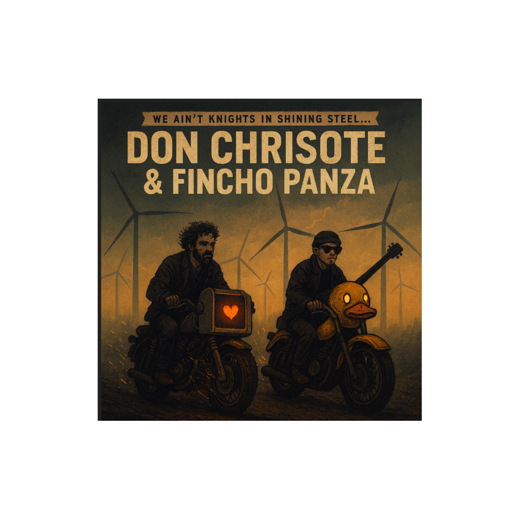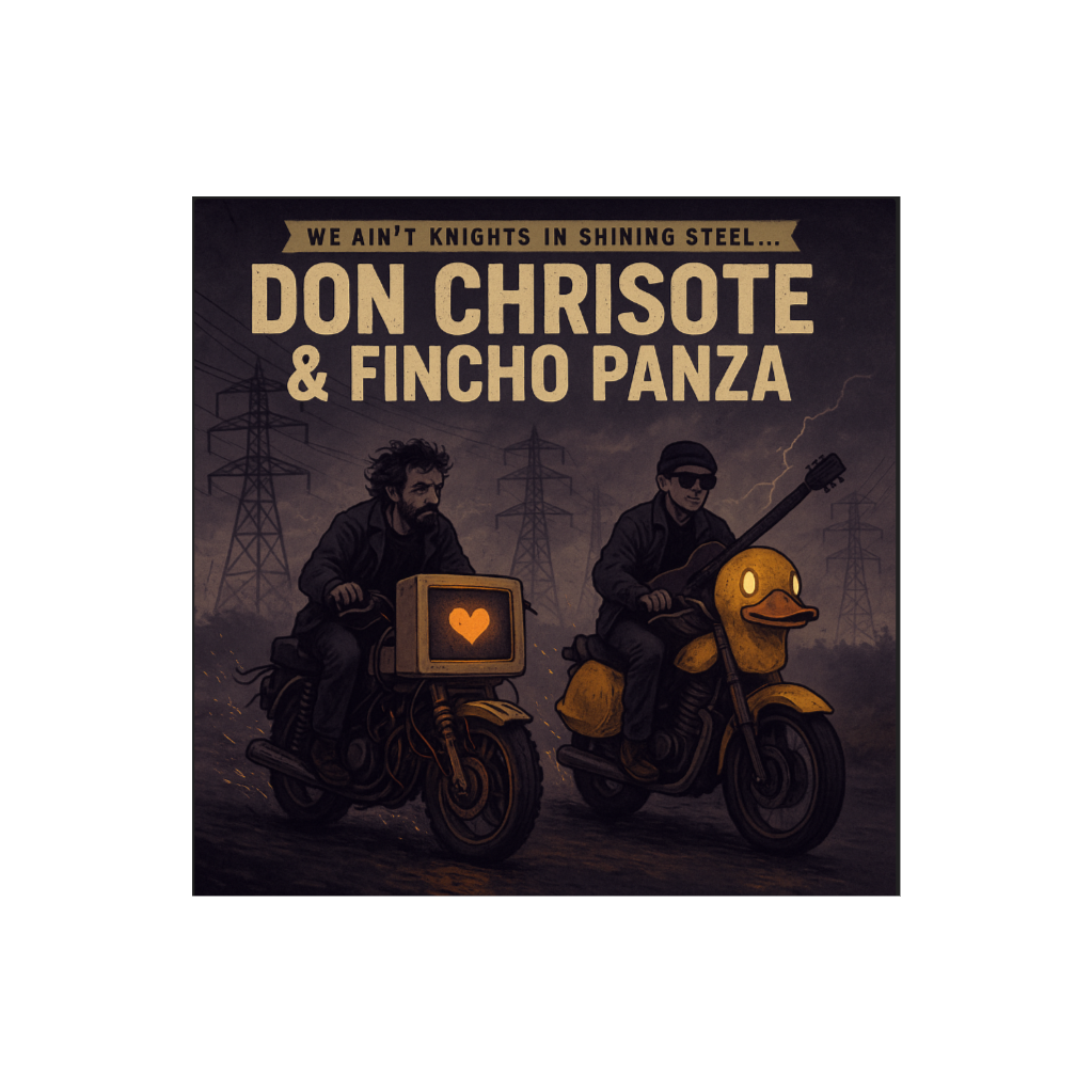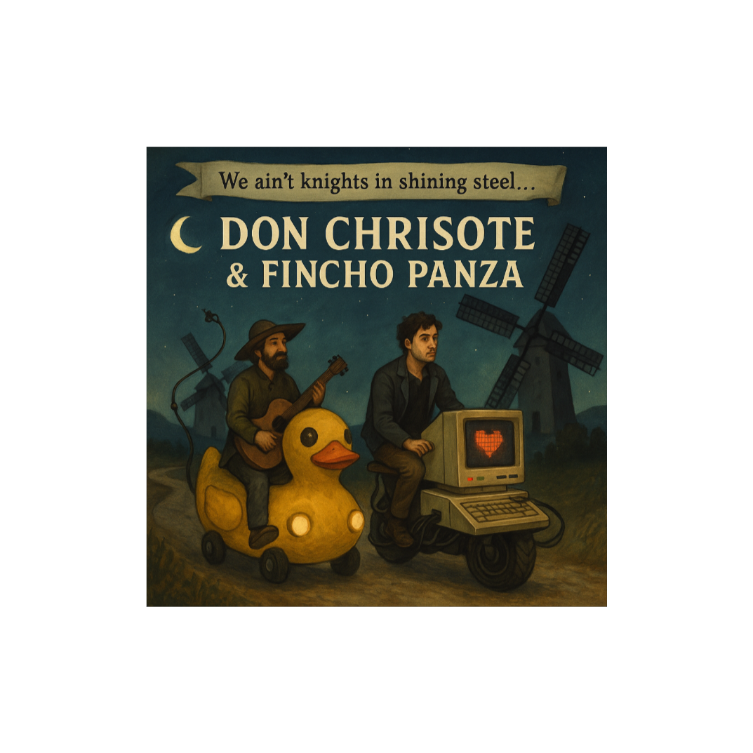 A heartfelt acoustic duet with a cinematic travel atmosphere, Guitar-led melody, emotional and storytelling vibe, First voice (Chris) sounds reflective and poetic, with a raw emotional tone, Second voice (Fin) is melodic, warm and natural – like a singing companion on a long journey, Include gentle harmonies in the chorus, Style: indie acoustic folk ballad, with some storytelling elements, Mood: nostalgic, sincere, and slightly quirky, Tempo: mid-paced, with emotional rise and fall