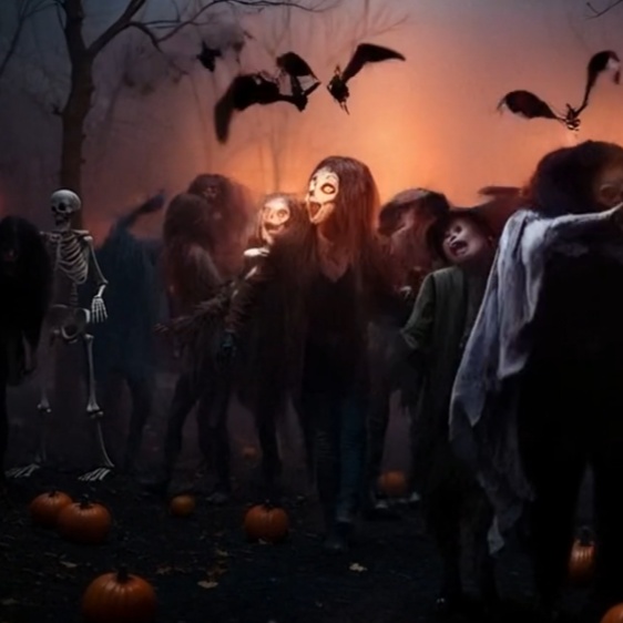 Halloween, ska punk, fun, bouncy, spooky, happy, silly, cinematic, paranormal, high quality clear vocals