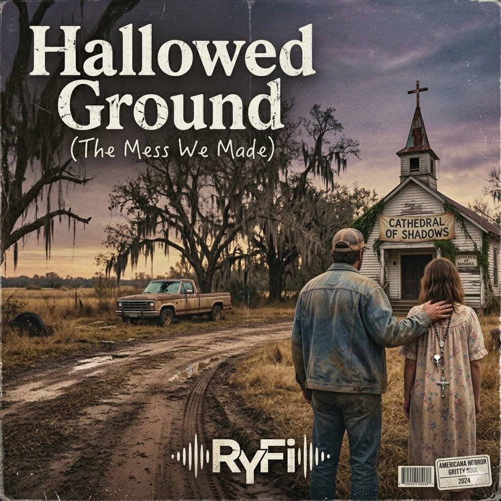 Dark Country-Trap, Southern Gothic Rock, 74 BPM (Double-time 148 BPM), Raw Gravelly Vocals, Haunted Slide Guitar, Deep Stomping 808 Bass, Dusty Banjo Arpeggios, Cinematic Strings, High-Fidelity, Intimate Whiskey-Voice, Start-Stop Dynamics, Master