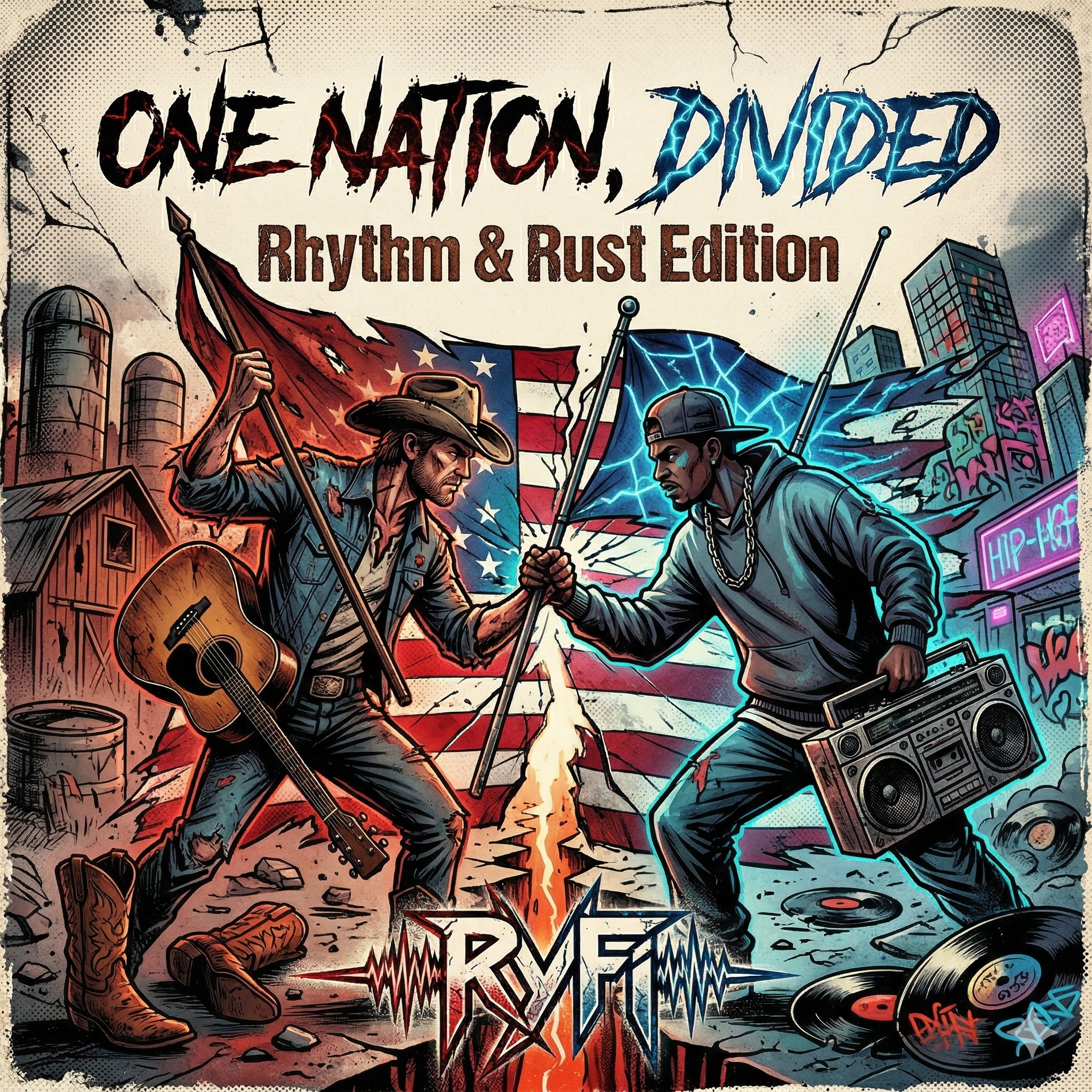 Hybrid genre battle, Country vs, Phonk Rap, Country/Rap Battle, Verse 1: Outlaw Country, dusty acoustic guitar, deep gravelly baritone, steady porch-stomp percussion, slide guitar accents, Verse 2: Aggressive Phonk Rap, heavy distorted bass, cowbell melodies, fast rhythmic delivery, dark cinematic synths, Bridge: High-tension crossover, dueling banjo and 808s, overlapping vocal tension, Outro: Fading Americana strings clashing with digital glitch, 90 BPM, Cinematic, Gritty, Patriotic