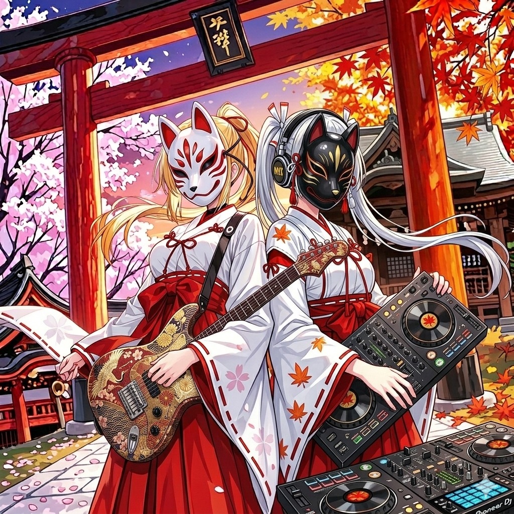 Shrine maidens, Kagura dance, Japanese flute, progressive rock, math rock, intelligent techno, mystical atmosphere, Shinto rituals
