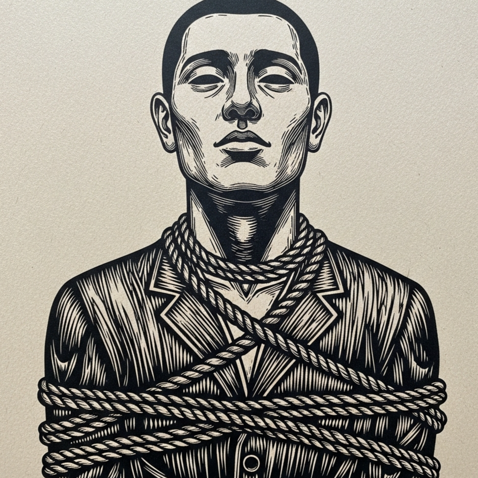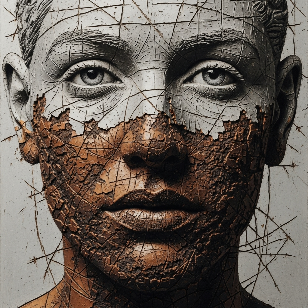 Industrial Folk-Noir, 75 bpm, Key: A minor, Production is a stark contrast of organic and inorganic textures, Primary Vocalist [Silas: baritone, weary, intimate, confessional, close-mic'd, weathered, bone-dry vocal, performance has vocal fry, cracked tones, whisper-crackle, hesitant phrasing, parched texture, behind-the-beat, spoken-word style builds to subdued insistence], Secondary Vocalist [The Chorus of Compliance: distant, ethereal, androgynous, glassy, hollow, monotone, straight-tone, chanting, heavily processed, serene, glacial, vocoded harmonies], Instrumentation: close-mic'd acoustic guitar (Am, G, C, F), persistent dissonant electronic drone (E flat), found-sound percussion (wrench on pipe, gear clicks, metallic scrapes), plodding rhythm with a heavy, low thud for a kick, ‑humming intro, ‑hum, ‑vocalise, ‑humming
