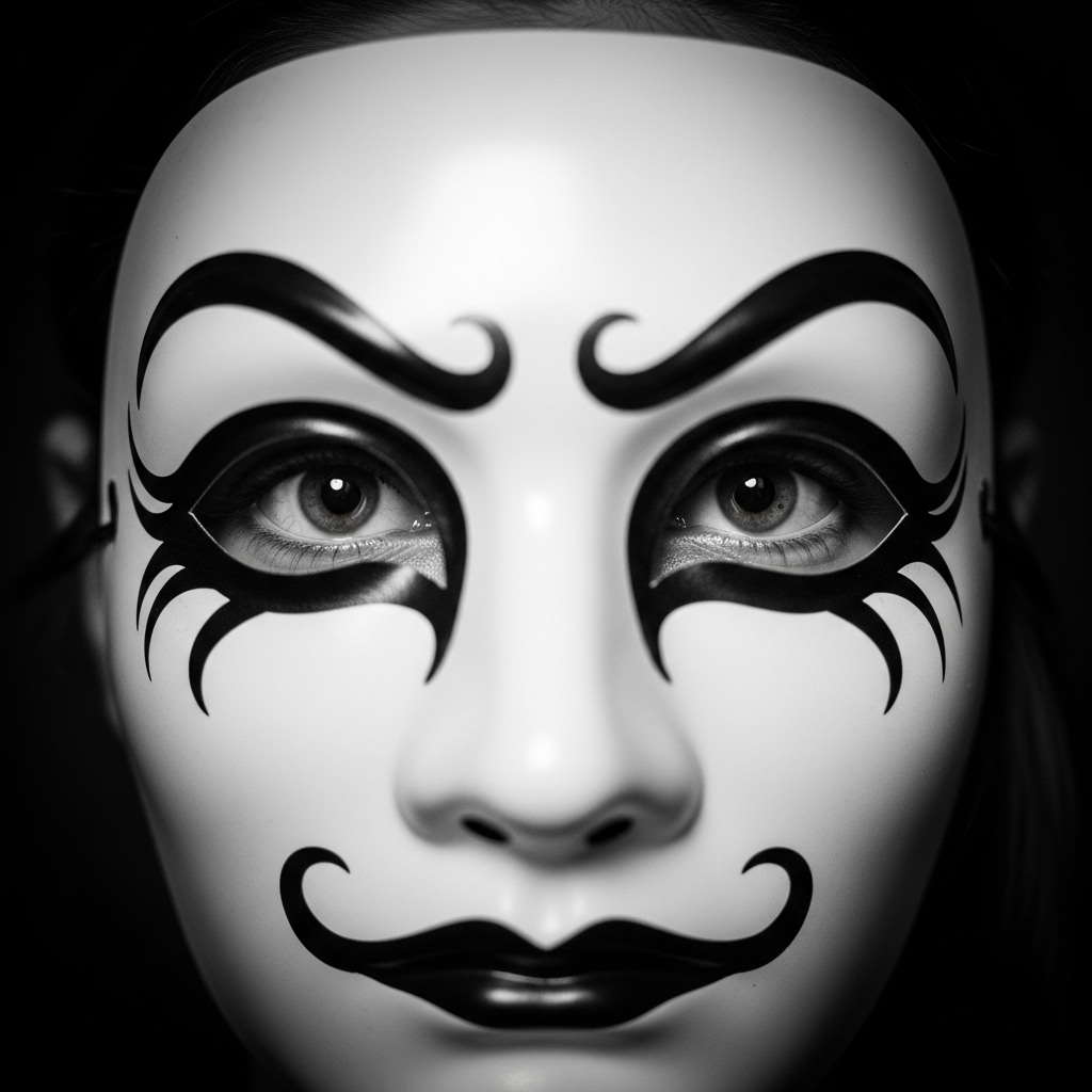 Darkwave Art Pop with Minimal Electronic elements and Theatrical Vocals, Sparse electronic beats with resonant percussion, deep bass frequencies, and atmospheric synth pads, Intimate yet powerful vocals with dynamic shifts from near-whisper to emphatic delivery, [Maestro vocals: resonant, smoky, controlled, versatile, intimate, powerful, textured, weathered, conversational, declarative, dramatic, precise diction, dynamic range, controlled vibrato, emotional intensity, theatrical delivery, occasional breath breaks, subtle vocal cracks on emotional peaks, slight rasp in lower register, controlled glottal fry for emphasis, occasional intentional pitch slides], The overall sonic weight is balanced between ethereal textures and grounded rhythmic elements, Counterpoint between music and lyrics, with upbeat or ethereal sounds accompanying lyrics about falsehood and illusion, Recurring musical motif transforms throughout the song, mirroring the evolution of the lyrical theme, ‑humming intro, ‑hum, ‑vocalise, ‑humming, ‑intro