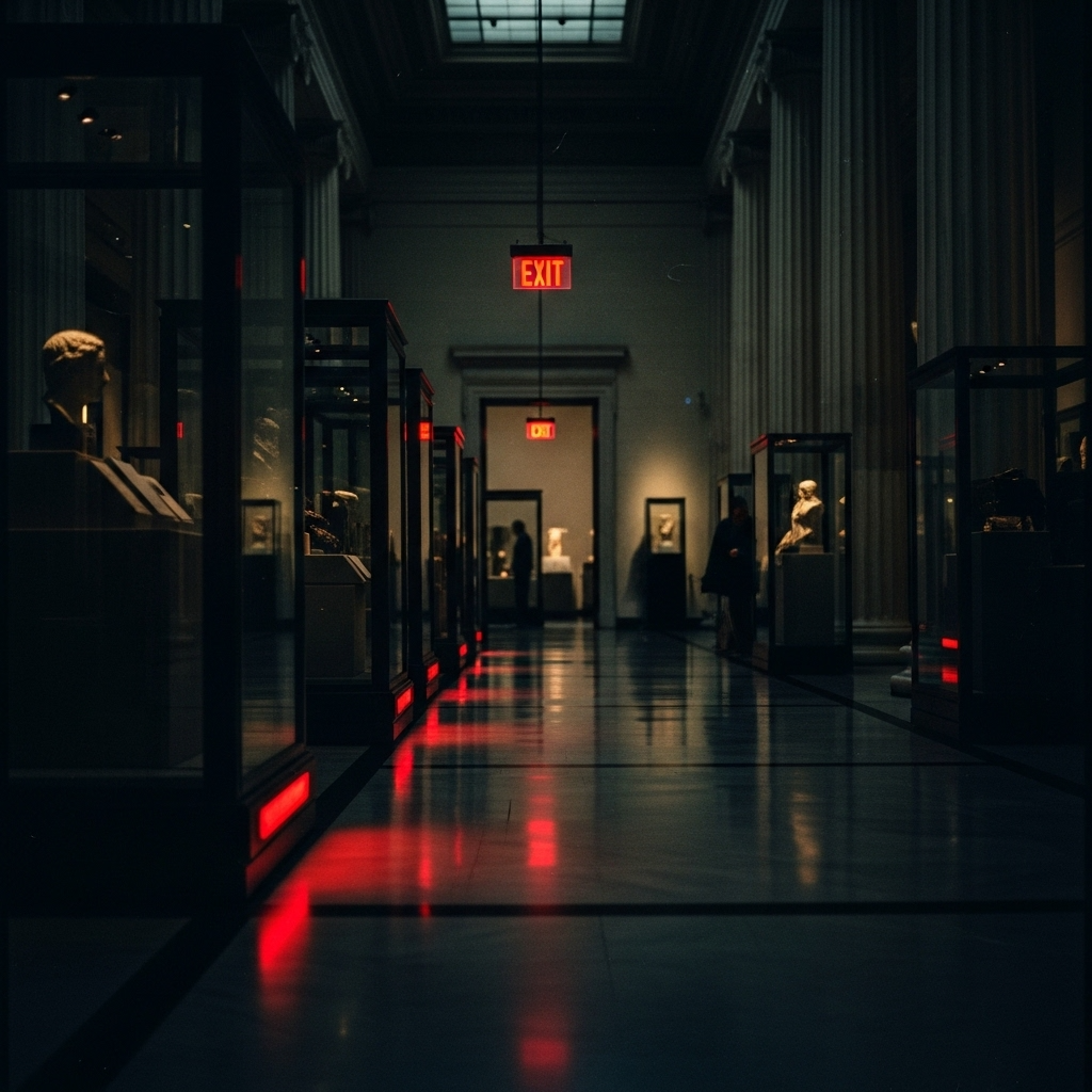 [genre: art pop, chamber pop, art rock] [mood: haunting, mysterious, introspective] [tempo: 72 bpm] [dynamics: intimate to explosive] [instruments: grand piano, string quartet, brushed drums, fretless bass, atmospheric synthesizers, distorted electric guitar] [Silas vocals: gravelly baritone, world-weary, intimate, occasional vocal fry, measured pace] [Echo vocals: ethereal, layered, distant, slightly detuned] [production: close-mic'd vocals, ambient room sounds, gradual build from sparse to dense arrangement, sudden dynamic shifts] [key: D minor] [era: 2020s] [style: cinematic, narrative-driven, emotionally complex] [theme: identity, memory, inheritance] [vibe: a midnight tour through an empty museum where the exhibits watch back], ‑humming intro, ‑hum, ‑vocalise, ‑humming, ‑intro