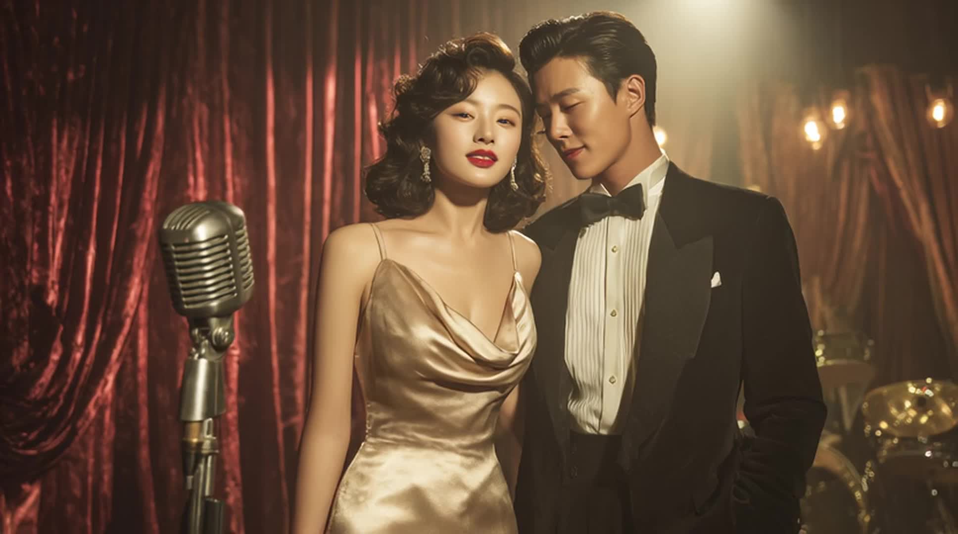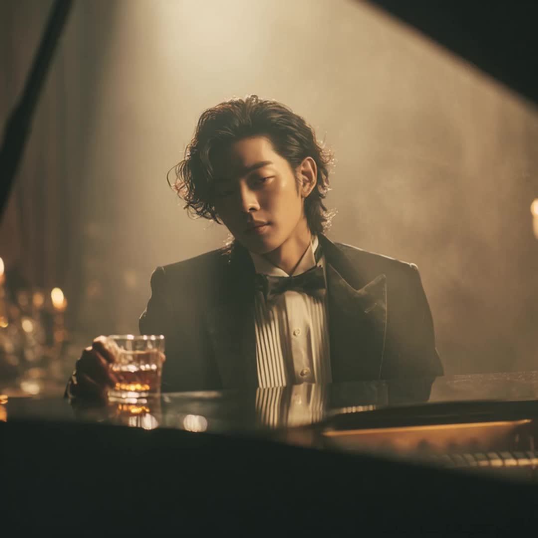 swagger vintage 60s club vibe, piano motifs, upright bass, brushed drums, and cinematic strings, layering a jazz-pop sophistication over a disco pop pulse, Verses stay minimalist and intimate, setting a smoky club vibe, The smooth Korean male vocal rides the groove with R&B phrasing and subtle rasp, culminating in the climactic, strong chorus, where strings and drums swell, locking into a confident disco-infused pocket, The arrangement balances late-night jazz swagger with catchy pop energy, maintaining an intimate vocal