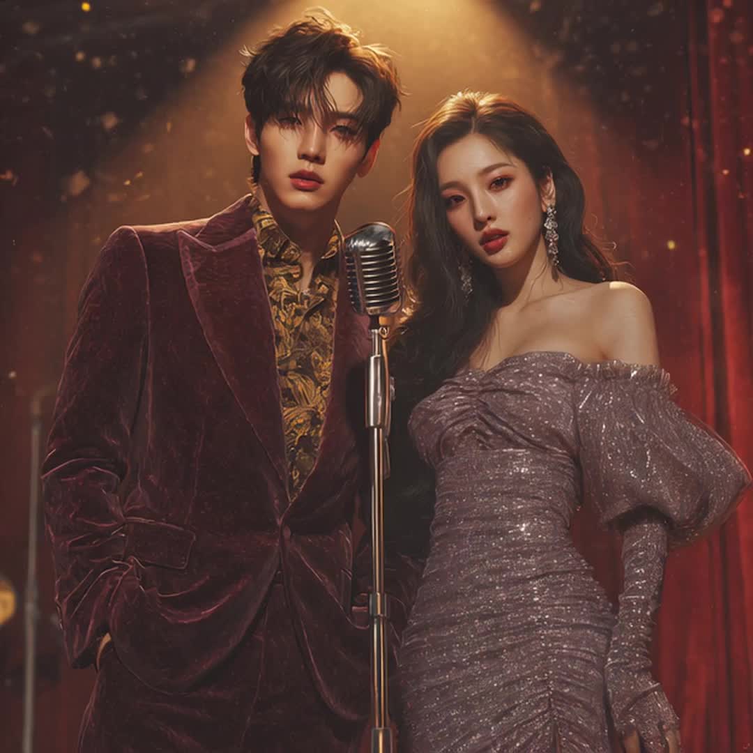 A glitzy fusion of retro funk-pop glam, channeling the velvet swagger of late-night R&B lounges and the theatrical grandeur of 80s synth-pop divas, Punchy drums pop through analog tape warmth, anchored by a slinky electric bass groove and glittering Rhodes piano stabs, Male vocals deliver silky charisma with falsetto flips and ad-libbed flourishes, while the female lead exudes theatrical elegance—equal parts heartbreak and heat, Big gospel harmonies swell into the chorus with disco strings and horn blasts, before stripping down to breathy confessions and building again, This is a showstopper: dramatic, flirtatious, magnetic—produced like a Grammy stage moment in Dolby Atmos