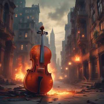 The track opens with a soft, haunting interplay between double bass and cello, echoing ominously, Sparse distorted guitar gradually enters, building tension, Drums surge in as intensity mounts, swelling into a metal climax with layered strings, heavy riffs, and pounding rhythms in an apocalyptic finale