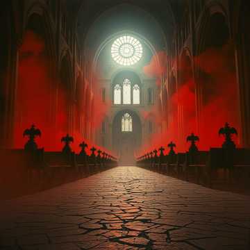 metal, Violent hybrid of death and thrash metal: blast-beat onslaught, rapid double-kick, chainsaw guitars in dissonant intervals, bass grinding in the low midrange, Vocals are deep gutturals with occasional higher screams; guitars trade tremolo-picked walls with chugging breakdowns, Arrangement surges from relentless speed to half-time lurches, with abrupt stabs and feedback squeals for maximum brutality, death metal, thrash metal