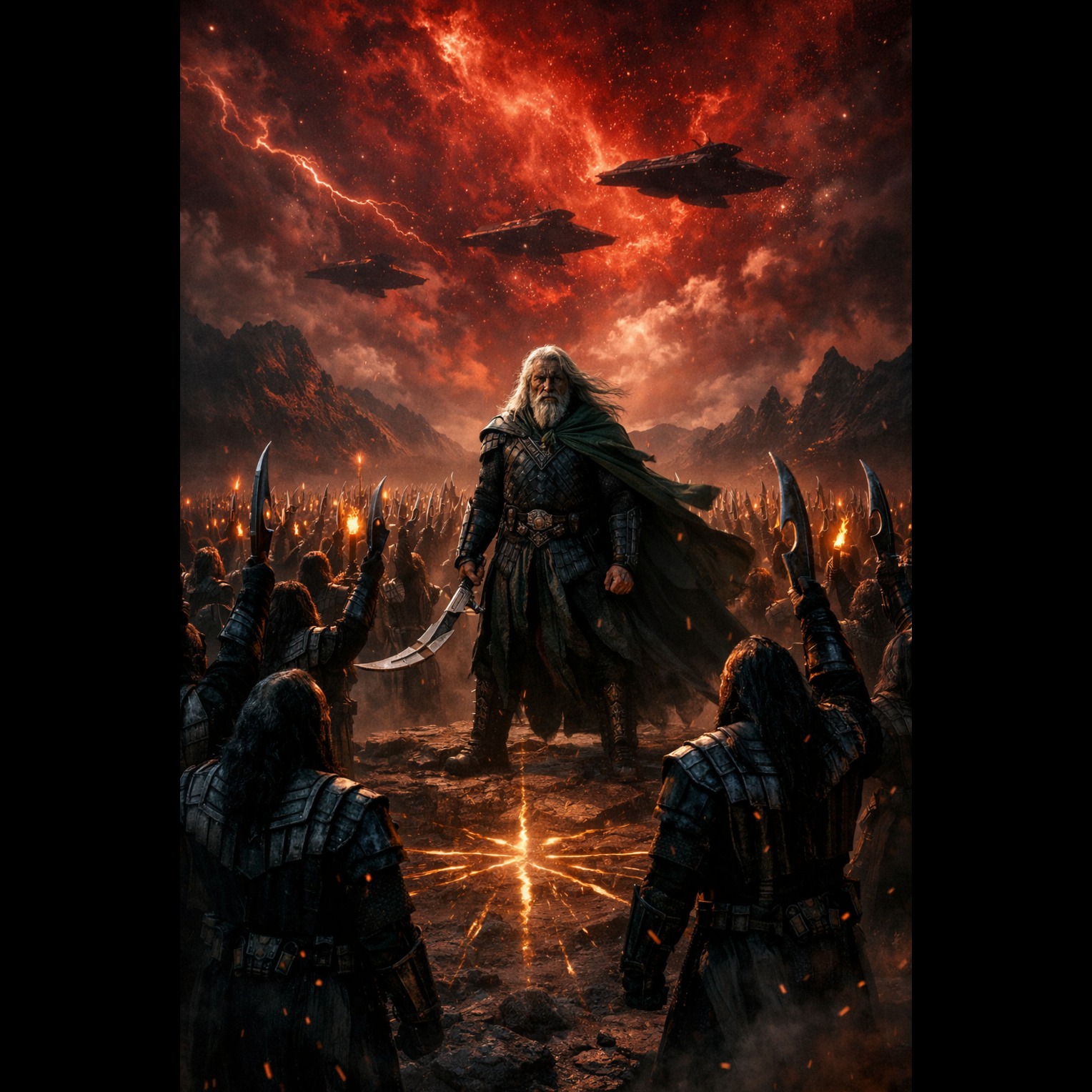 Epic Klingon warrior anthem inspired by Myrddin’s Armee, powerful yet honorable rather than brutal, rising from solemn ritual to massive warrior unity, Deep ceremonial war drums and ancient horns begin slow and atmospheric, gathering warriors, Distorted electric guitars grow into heavy heroic riffs, strong but dignified, Bass and drums move between tribal march and explosive rock drive, Klingon chant sections in tlhIngan Hol replace rap with rhythmic call-and-response rally cries, Pre-chorus tightens into whispered warrior chants before the chorus erupts into a huge battle-hymn with massive gang vocals, Male lead vocal deep, rough, commanding yet protective, Large warrior choir with powerful low harmonies, subtle children’s choir in the chorus symbolizing hope and the future, Cinematic strings, low brass and war horns build orchestral swells, Atmosphere: ancient honor, unity, courage and rising strength, Production massive, cinematic, stadium-scale with thunderous percussion