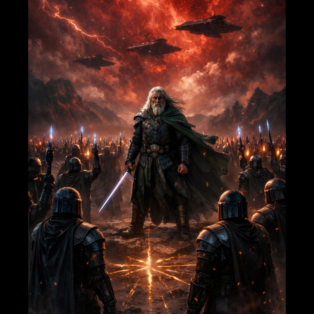 Epic Mandalorian warrior anthem inspired by Myrddin’s Armee, rising from solemn clan gathering to massive battle-hymn unity, Deep tribal war drums and low ceremonial horns open slowly, atmospheric and ritualistic, like warriors assembling before battle, Distorted electric guitars enter gradually with heavy heroic riffs, powerful but honorable, Bass and drums alternate between tribal marching rhythm and explosive rock drive, Mandalorian chants in Mando’a replace rap sections with rhythmic call-and-response clan shouts, Pre-chorus tightens into tense whispered warrior chants before the chorus erupts into a huge anthem with massive gang vocals shouting “Vode an!”, Lead vocal deep, rough, commanding warrior tone with proud intensity, Large male choir layered with strong low harmonies, Subtle children’s choir in the chorus symbolizing legacy and future generations, Cinematic strings and low brass add epic scale, Atmosphere: honor, unity, courage, clan loyalty, Production massive, cinematic
