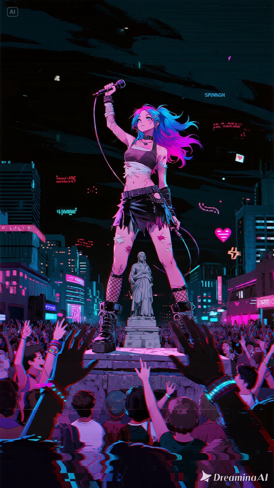 live performance, live in concert, stadium rock show, big crowd cheering, audience clapping, natural room reverb, raw but powerful vocals, slight room ambience