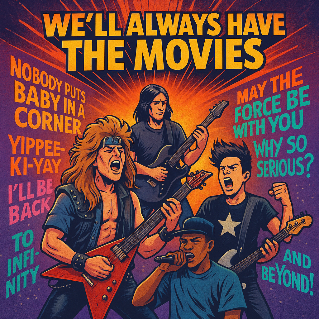 Epic multi-era rock medley made from famous movie quotes, change the singer at each transition, Starts as 80s glam metal, shifts into 90s rap rock, then grunge, then 2000s pop punk, with a country-rock bridge and a huge stadium rock finale, Energetic guitars, anthem-like chorus, layered crowd chants, nostalgic and cinematic