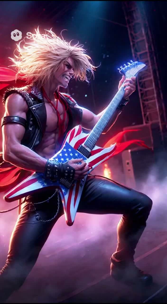 screaming male vocals, electric guitar, patriotic, 80s stadium rock, rock, guitar solos