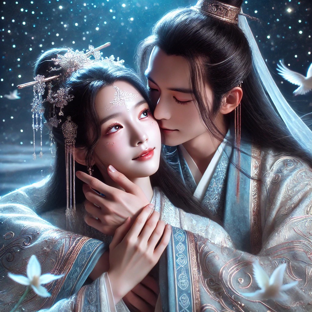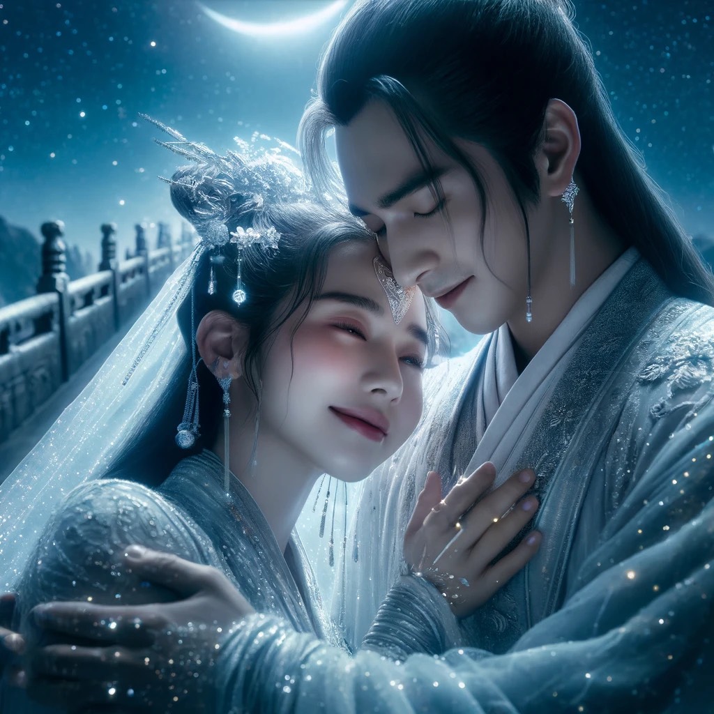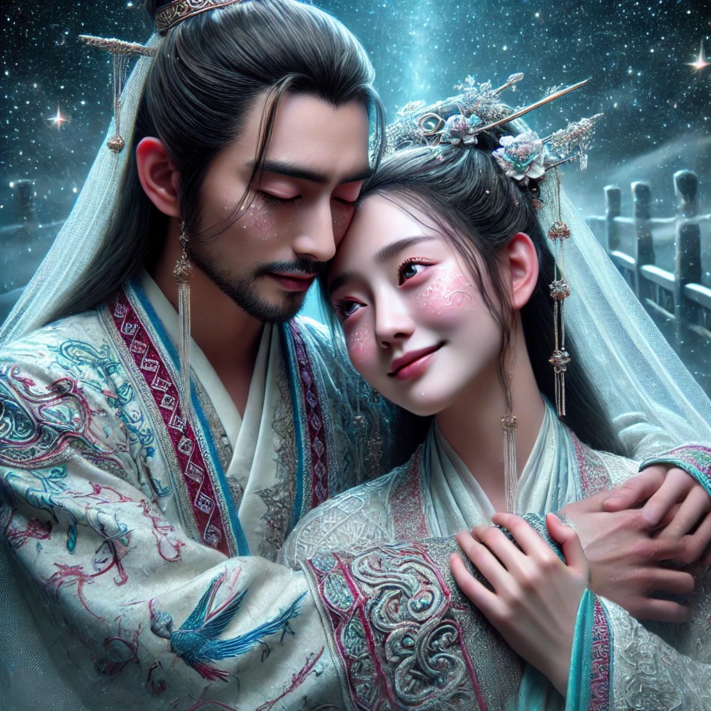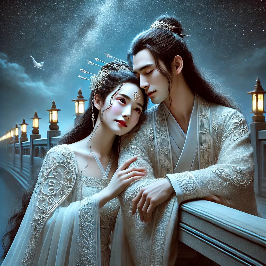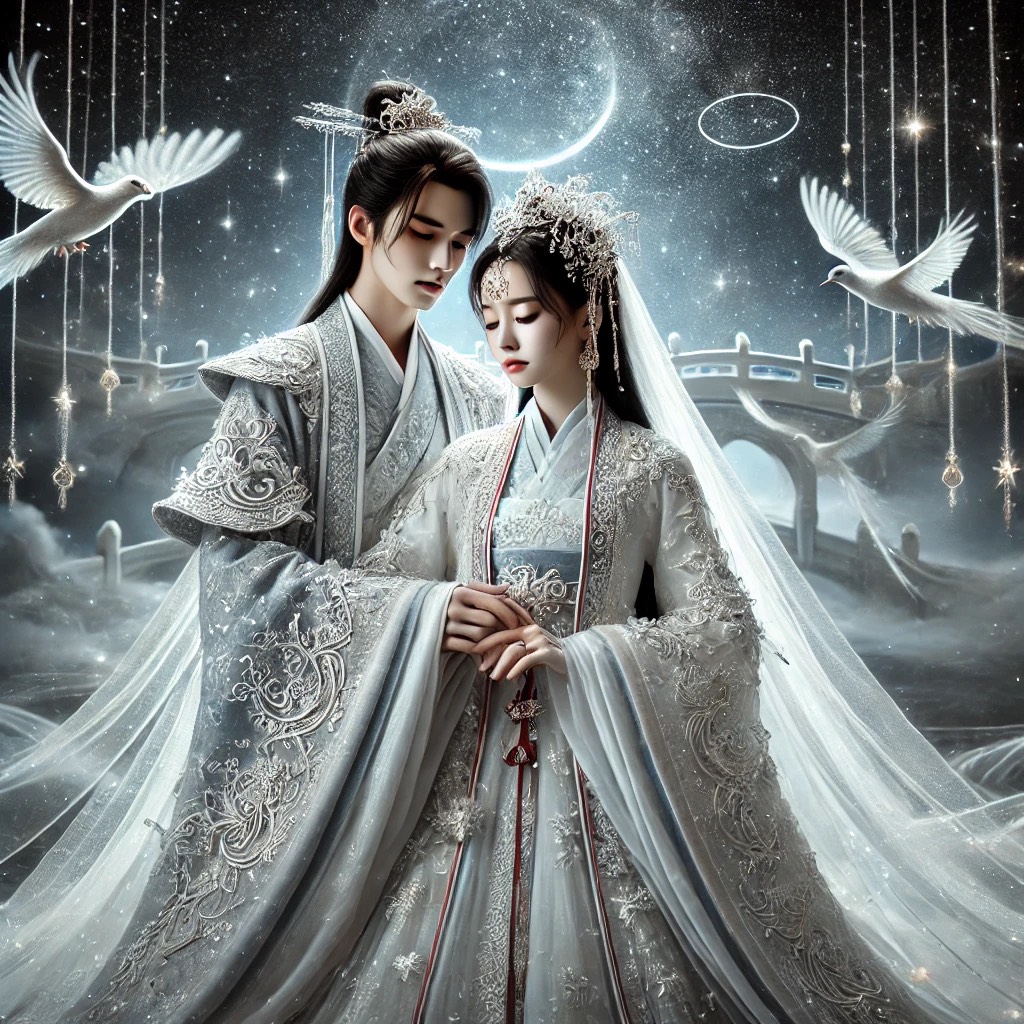 A celestial fusion of ethereal dream pop and traditional Chinese folk melodies, layered with orchestral crescendos and electronic ambient textures, harp, flute, erhu, guzheng, dizi, piano, violin