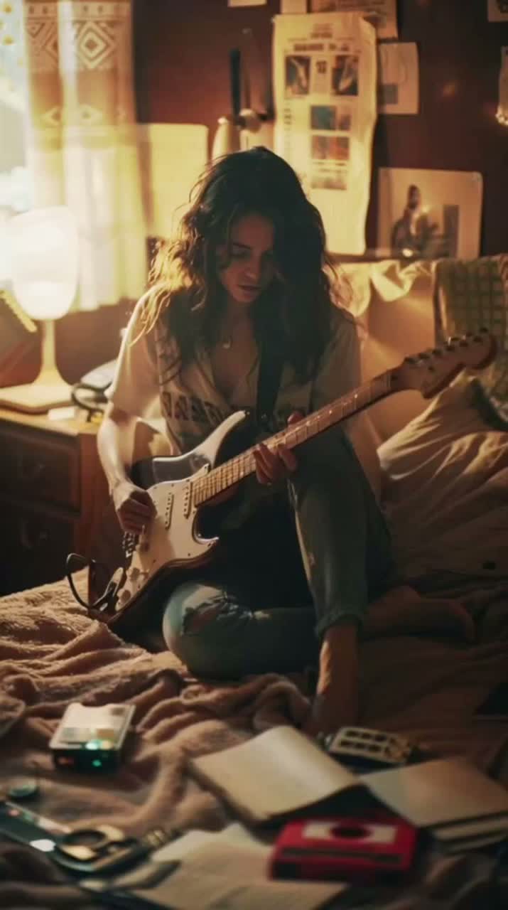 lofi indietronic psychedelic indie rock, emotional female duet vocals, soft airy falsetto layered with slightly distorted lead, rich analog-style vocal effects with phaser, chorus, and tape saturation, warm fuzzy overdriven guitars with gentle modulation, minimal but hypnotic looping riffs, subtle psychedelic synth textures, deep warm bass with smooth movement, loose human timing feel, dreamy washed atmosphere without shimmer, no bright highs, controlled darker tone, dual vocals with call-and-response and blended harmonies, wide stereo choruses and intimate mono verses, gradual emotional build, tape warble and analog-style degradation on vocals, slightly detuned layers for organic imperfection, repetitive motifs evolving slowly, minimal arrangement that expands in width not density, soft compression with glued mix, nostalgic introspective tone, hypnotic and immersive, no gloss, no shimmer, restrained and warm