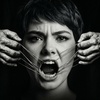 atmospheric hard techno, cello melody leading, raw gritty breathy female vocals, guttural death metal growls