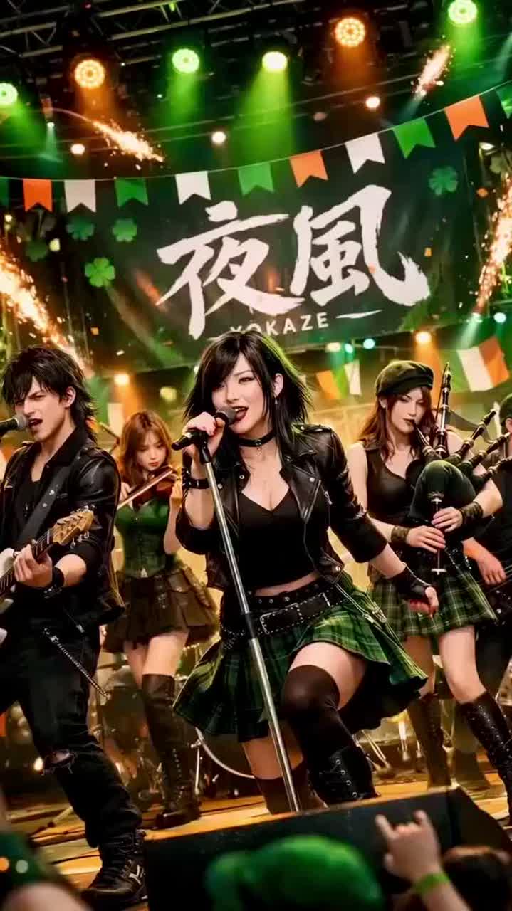 St, Patrick’s Day Irish punk chaos, Japanese-Irish folk punk at 190 BPM, 4/4, full-throttle live riot energy, explosive male and female twin vocals, wild sing-along chorus, pub-punk aggression, festival mosh-pit atmosphere, fast and reckless Celtic dance drive, Fiddle leads with blazing hooks, tin whistle screams through the mix, uilleann pipes and bagpipe drones ignite the intro and outro, bodhran pounds with stomping Irish pulse, distorted electric guitar slams power chords nonstop, Tsugaru shamisen cuts in with sharp percussive attack, taiko adds huge cinematic impact, electric bass growls with gritty midrange and driving punk bounce, Male vocal is raw, rough, shouted, street-folk punk with urgent attack, Female vocal is fierce, taunting, sharp, high-energy, rebellious and melodic, Verses alternate, choruses explode together in massive twin-vocal hooks, Gang shouts, call-and-response chants, stomp-clap sections, shouted Irish festival slogans, drunken pub energy, sweat, roar, Irish