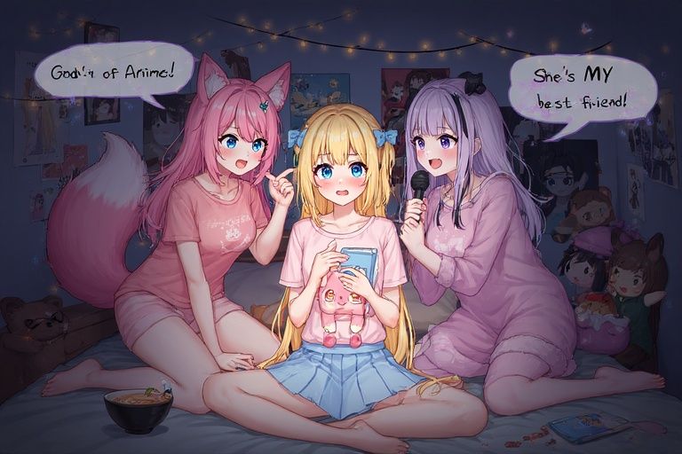 A playful but dramatic dark bubblegum pop track sung with two little-girl vocalists (Cupcake and Fox Girl) and a third voice (God of Anime), Cupcake and Fox Girl are arguing in a funny but emotional way about who is the better friend of God of Anime, Each lists 5 reasons why sheโs the closest friend, in a slightly sassy, dramatic, and competitive tone, The voices take turns, then overlap with playful shouting (โSHEโS MINE!โ), God of Anime interrupts with a sweeter, calmer voice, trying to stop the fight and remind them that theyโre both loved equally, The style is: