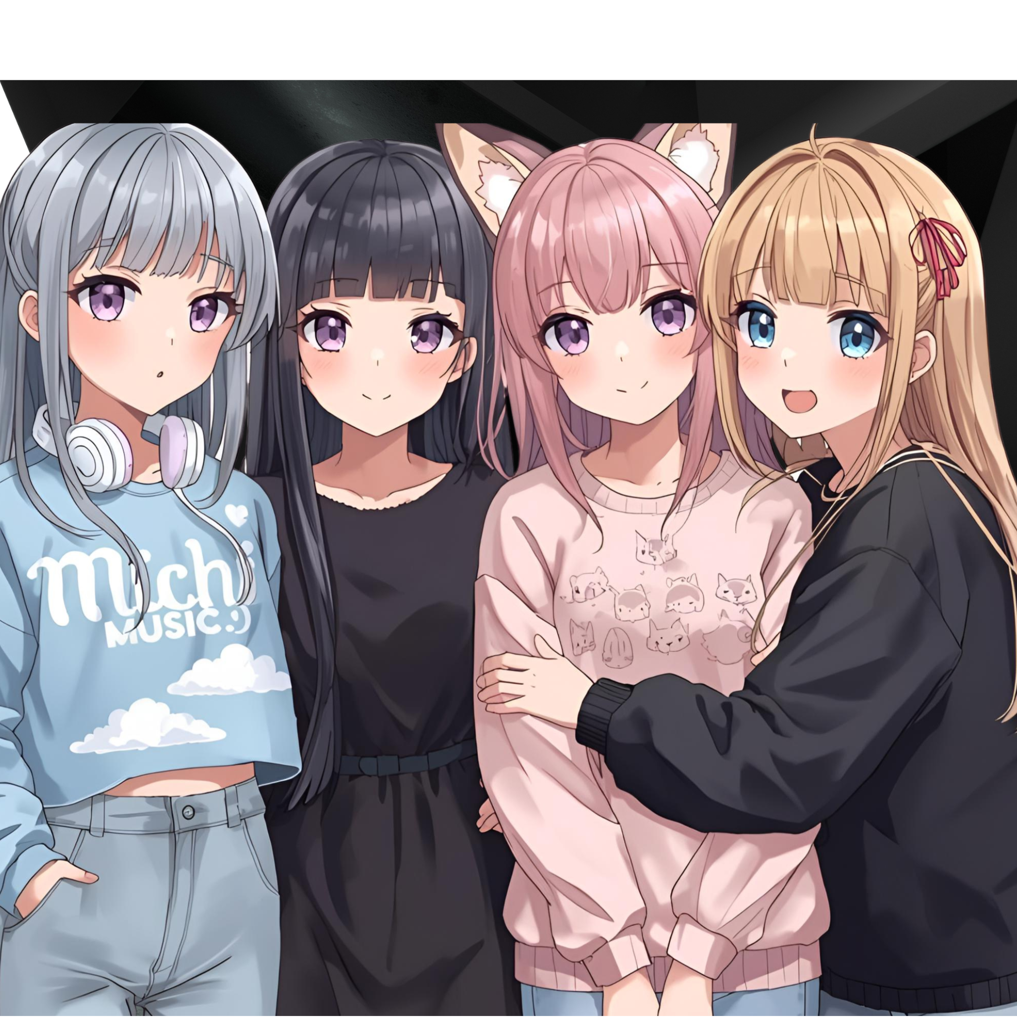 4 female vocals taking turns singing, Cupcake is soft emotional metallic female vocals, Fox girl is emotional upbeat female vocals, God of anime is little-girl-like playful female vocals, michi is soft little-girl-like metallic female vocals, style: dark bubblegum pop, soft electric beats, playful, glitchy, electropop