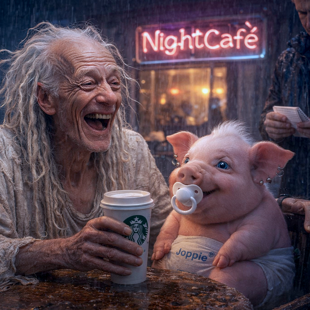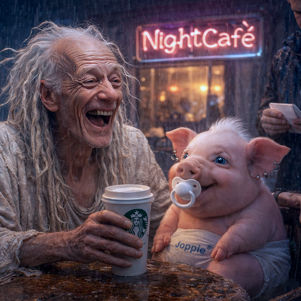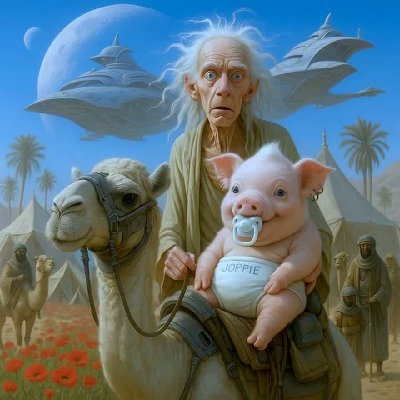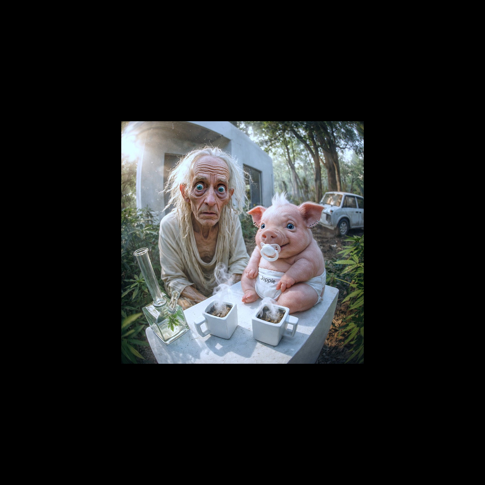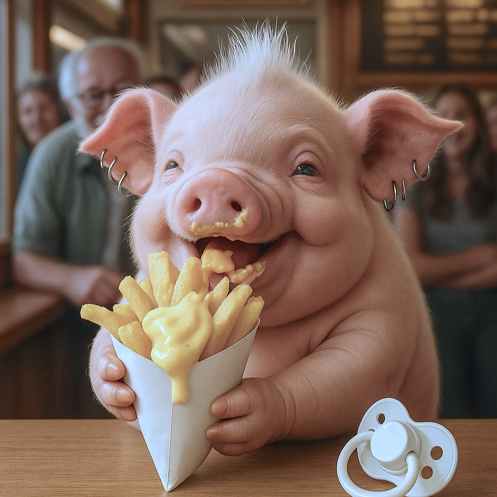 Upbeat reggae–ska hard rock fusion with male blues-rock vocals — about Joppie the pink piglet enjoying his fries in an Eindhoven friet-tent, sung in English with bits of Dutch, Fun, warm, and groovy!