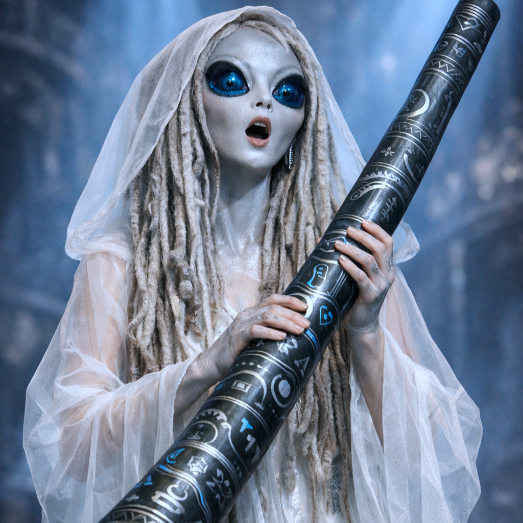 Experimental, unique, Ethereal alien chant music, spiritual and ritualistic, starting slow and hypnotic, inspired by Enigma’s early 90s sound but extraterrestrial, all instruments have a surreal alien sound, ending with an epic speedy tremolo moments with rapping and distorted hard-rock, Deep ambient pads, breathy choirs, distant echoes, low tribal percussion, subtle drones, reverberant space, ancient-temple-meets-cosmic-cathedral atmosphere, Mystical, ceremonial, transcendental, otherworldly, timeless, non-human sacred music