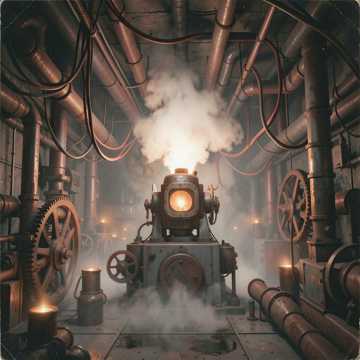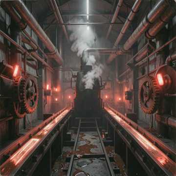 industrial dark ambient, glitch core, 85 BPM, TB-303 bassline, distorted kick drum, metallic percussion, granular stutters, tape saturation, cavernous plate reverb, sub-bass drone, filtered noise bursts, stereo delay throws, analog crackle, ritual dread, oppressive weight, suspended tension, 1990s industrial, widescreen mix, creepy whispers, mechanical ASMR, dark industrial ambiance, layered vocals und paranoia core