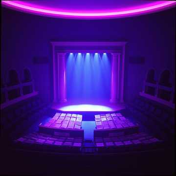 danceable and warm, Scene: A shadowed amphitheater with no audience, Pulsing lights flicker behind floating pages, burning screens, scrolling feeds, Two chairs, One echo, Time bends