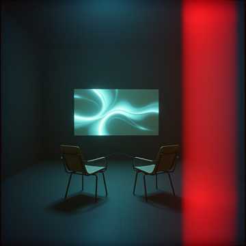 danceable and warm, Scene: A dim void, A table, Two chairs, One screen flickers behind them, never still, The woman sits, man enters, trailing antennae of light