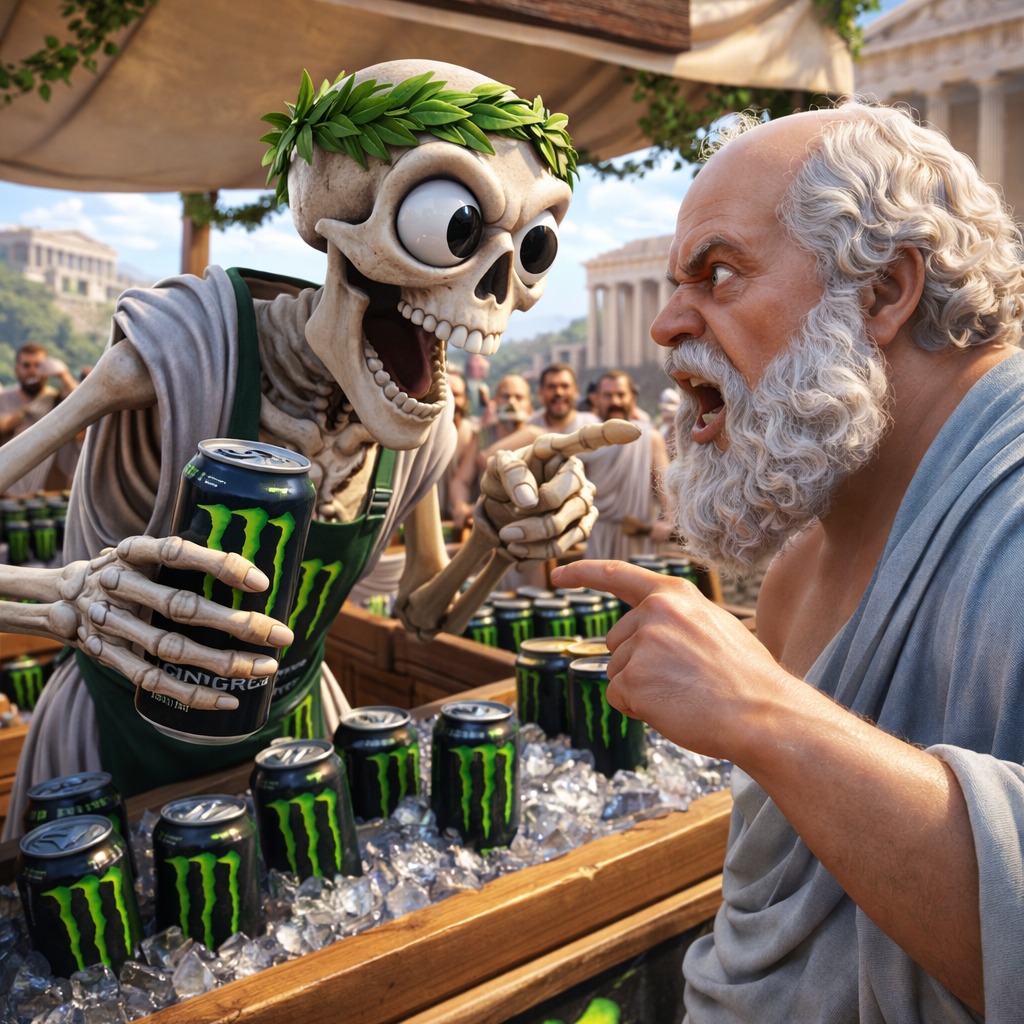 Comedic rap song with a playful, theatrical tone, Mid-tempo hip-hop beat (90–105 BPM) with bouncy drums, punchy 808s, and quirky instrumentation inspired by Ancient Greece (lyre plucks, flute melodies, light hand percussion layered over a modern trap beat), Male or androgynous vocal with expressive, exaggerated delivery—switching between deadpan frustration and animated, sarcastic outbursts