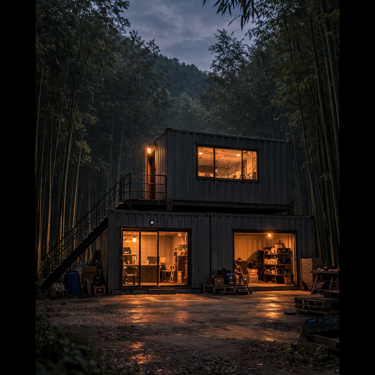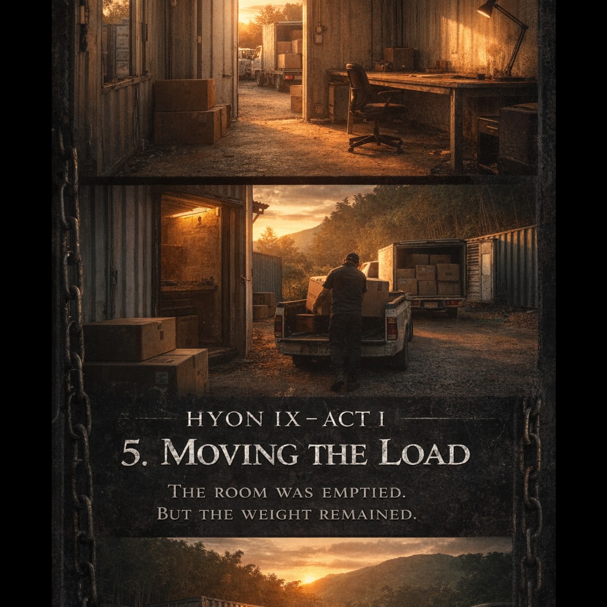 Dark cinematic industrial metal atmosphere, slow tempo 65–70 BPM, deep low drones and distant metallic ambience, Heavy sub-bass pulses like slow footsteps, muted distorted guitar textures, minimal industrial percussion, echoing warehouse reverb, No melody in the beginning, only cold ambient tension, Gradually introduce low cinematic strings and distant taiko-like hits, creating the feeling of empty space and heavy movement, Background texture should feel like machines being removed from an abandoned workshop, metallic echoes, slow mechanical rhythm, Emotion: exhaustion, weight, closure, quiet determination, Narration must remain clearly in front of the mix, No singing, no chorus, instrumental cinematic metal soundscape only, Ending: long fading drone and distant metal resonance, symbolizing the end of Act I, style: cinematic industrial metal, dark ambient metal