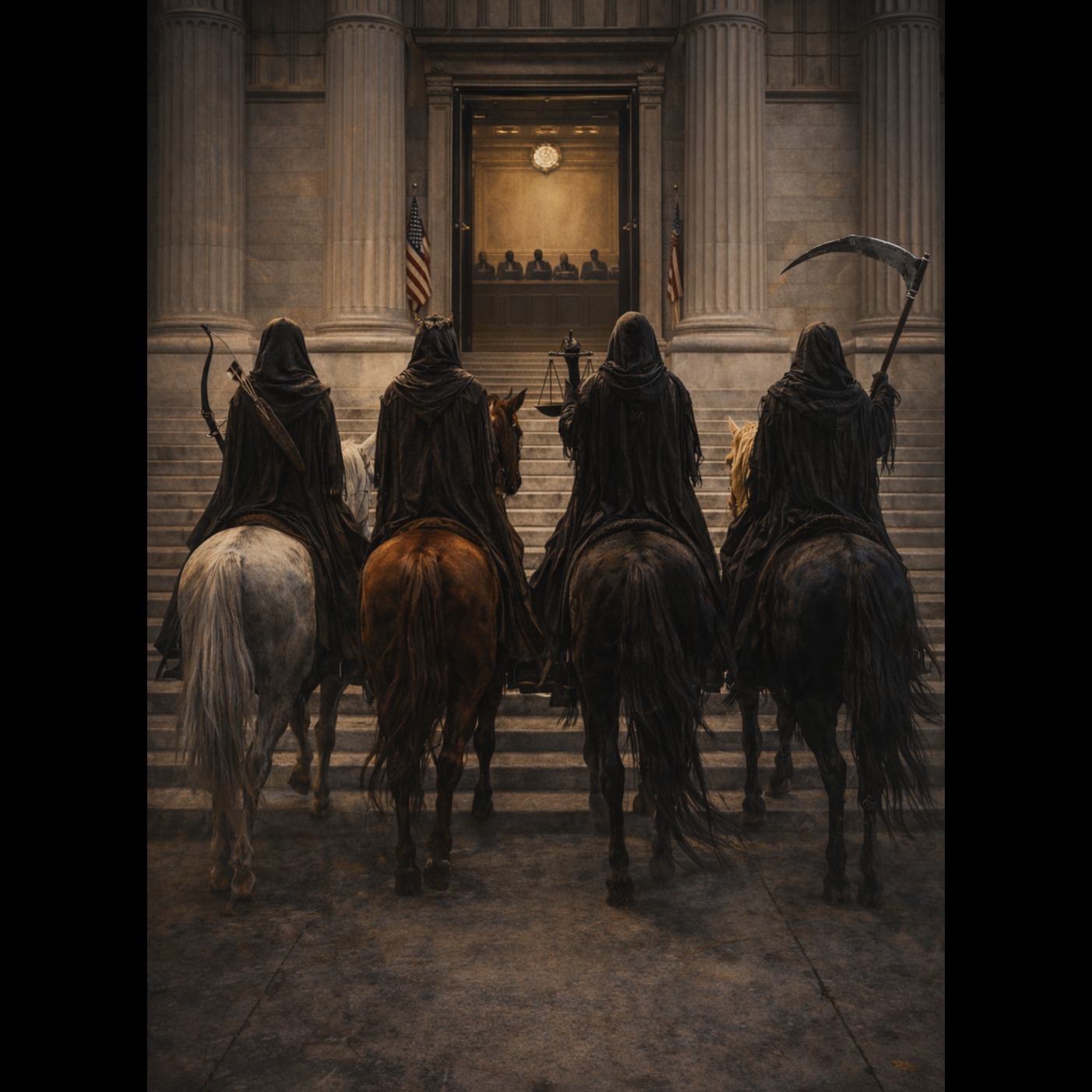 Epic apocalyptic metal with cinematic weight, Tempo starts at 96 BPM, gradually accelerating to 140 BPM in final chorus, Dark orchestral intro with low male choir and distant war drums, Heavy down-tuned guitars with crushing palm-muted riffs, industrial texture layers, and aggressive but controlled double-kick drums, Verses are restrained and tense, vocals low and gritty, almost spoken-word, Pre-chorus builds with rising strings and distorted synths, Chorus explodes with full orchestra, massive guitars, and shouted backing vocals, Breakdown features half-time groove, sub-bass impacts, and echoing chants, Final chorus is relentless and triumphant, symbolizing endurance rather than victory, Mood: judgment, resistance, survival, testimony, No hope clichés — raw, dignified defiance