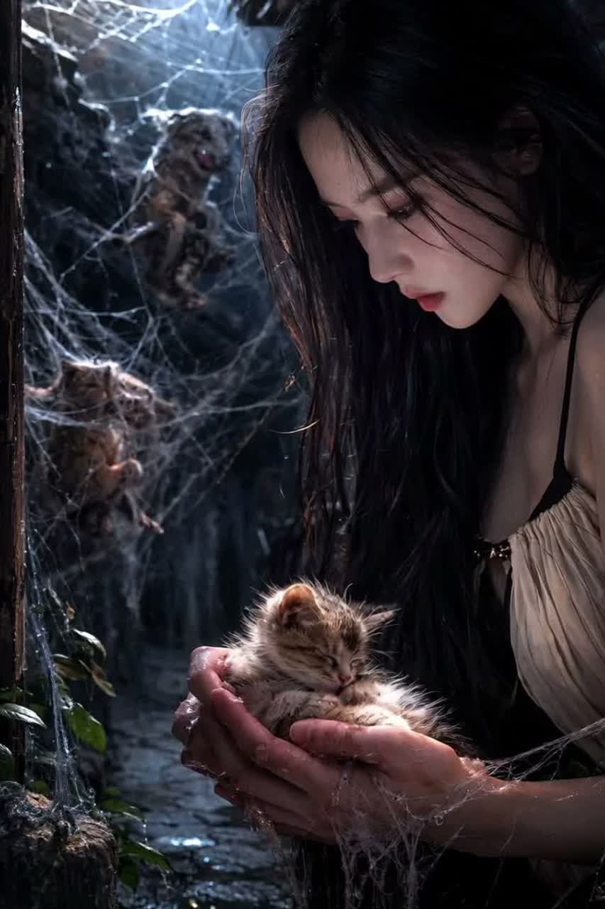 Atmospheric dark metal, 90 BPM, Slow cinematic intro with piano and ambient drones, Gradual build with deep drums, low cello pads, and distorted guitars, Powerful emotional Korean female vocal, Theme: discovering a giant spider web trapping animals near a house gate and rescuing one surviving kitten, Mood: calm morning → shock → fear → desperate rescue → fragile hope, Atmospheric cinematic dark metal, slow build, emotional storytelling