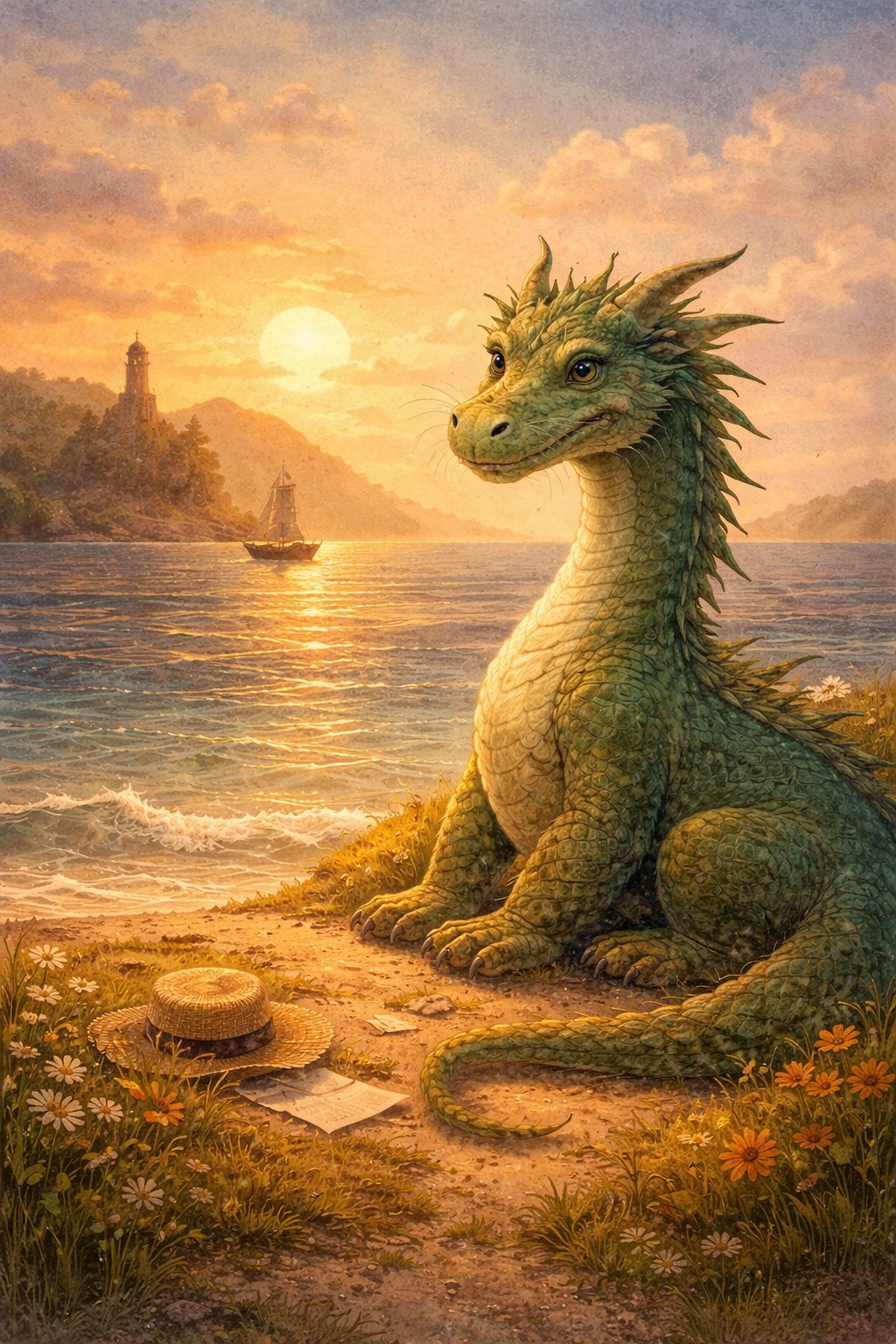 A gentle, story-driven folk song inspired by late 1960s to early 1970s English-language folk music, Slow to mid-tempo, warm and unhurried, with a reflective, nostalgic tone, Instrumentation is simple and acoustic-focused: fingerpicked acoustic guitar at the center, light strumming, subtle bass, and occasional soft harmonica or minimal strings, No heavy percussion—rhythm is implied rather than driven, Vocals are intimate and sincere, slightly wistful, delivered as if telling a quiet story rather than performing, Melody is simple, memorable, and flowing, with a childlike innocence layered over adult reflection, Lyrics feel timeless and poetic, blending gentle fantasy imagery with themes of memory, distance, growing up, and quiet loss, The mood is tender and melancholic, but never dark—there is warmth, acceptance, and emotional honesty throughout, Overall atmosphere evokes classic folk storytelling: calm, heartfelt, nostalgic, and emotionally resonant, like a song remembered from chil