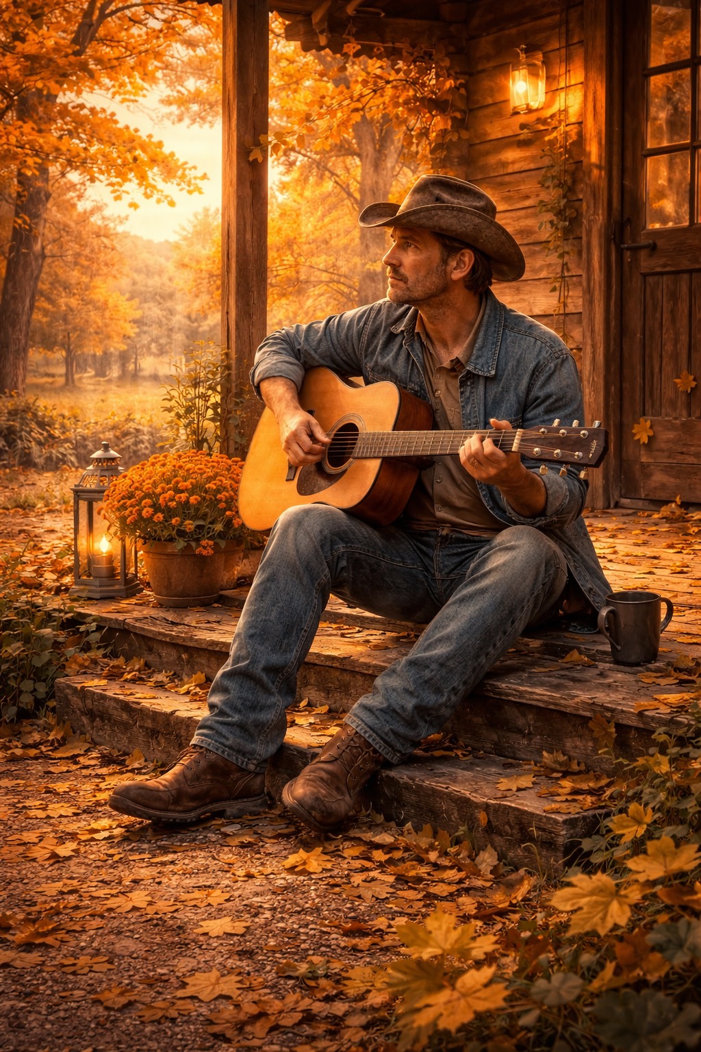 A Warm, Reflective Country Folk / Americana Ballad With Intimate Storytelling, Mid-tempo (72–84 BPM) featuring fingerpicked acoustic guitar, gentle strumming, subtle electric guitar textures, upright bass, and light brushed drums, Lead vocals are close-mic’d, natural, and emotionally sincere, with a calm, grounded delivery that emphasizes lyrical clarity and warmth, Choruses open with soft harmonic layering rather than power, creating a sense of emotional lift without losing intimacy, The arrangement grows gradually across the song, adding light instrumentation and ambience while preserving space and dynamics, The overall sound feels organic, timeless, and human—evoking changing seasons, quiet resilience, and reflective moments at dusk, Clean, balanced mix with natural dynamics, warm midrange, controlled low end, and a spacious stereo field optimized for headphones and long-form listening