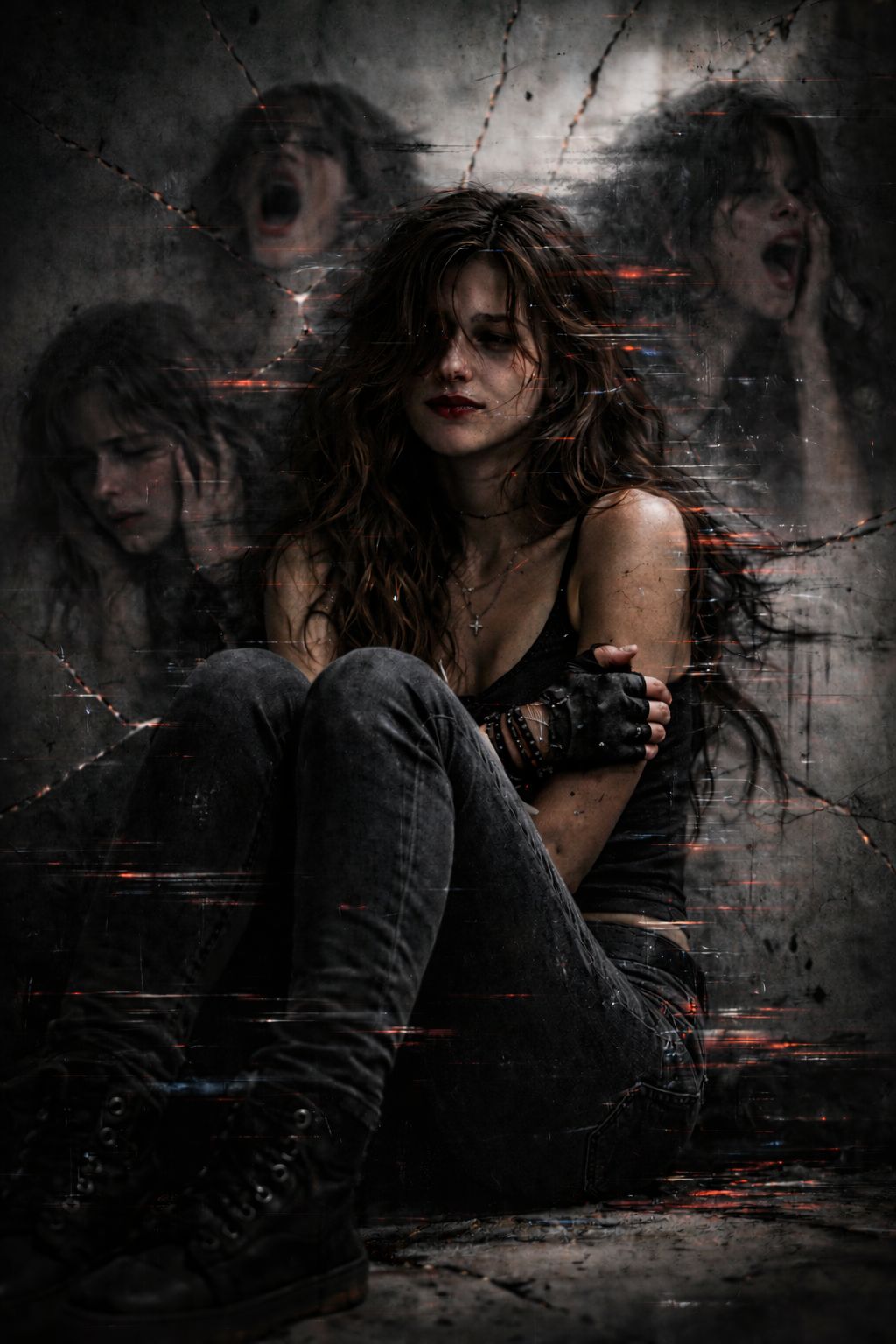 [Nu metal inspired by early 2000s heavy alternative metal, Down-tuned 7-string guitars (Drop A), thick distorted riffs, syncopated rhythm, Heavy bass with gritty tone, Aggressive but controlled drumming with dynamic stops, Verses: dark, tense, minimal instrumentation, almost whispered female vocal, Pre-chorus: rising tension with dissonant guitar harmonics, Chorus: explosive, emotional scream-sung vocal, Minor key, dark atmosphere, Theme: psychological shock, humiliation, survival, No polished pop production — raw, heavy, emotional, Mood: internal collapse turning into resistance, Atmosphere: concrete room, fluorescent light flickering, emotional fracture