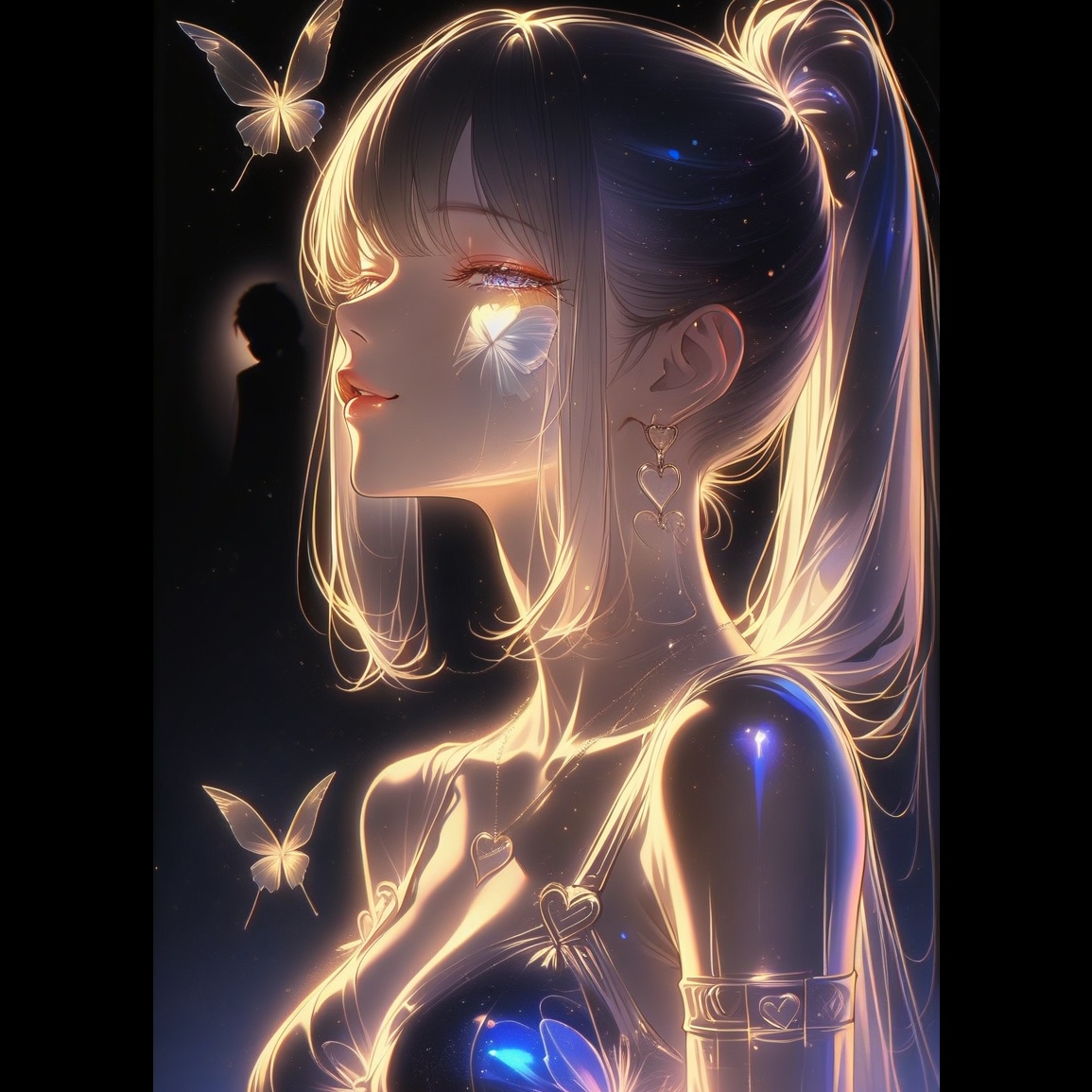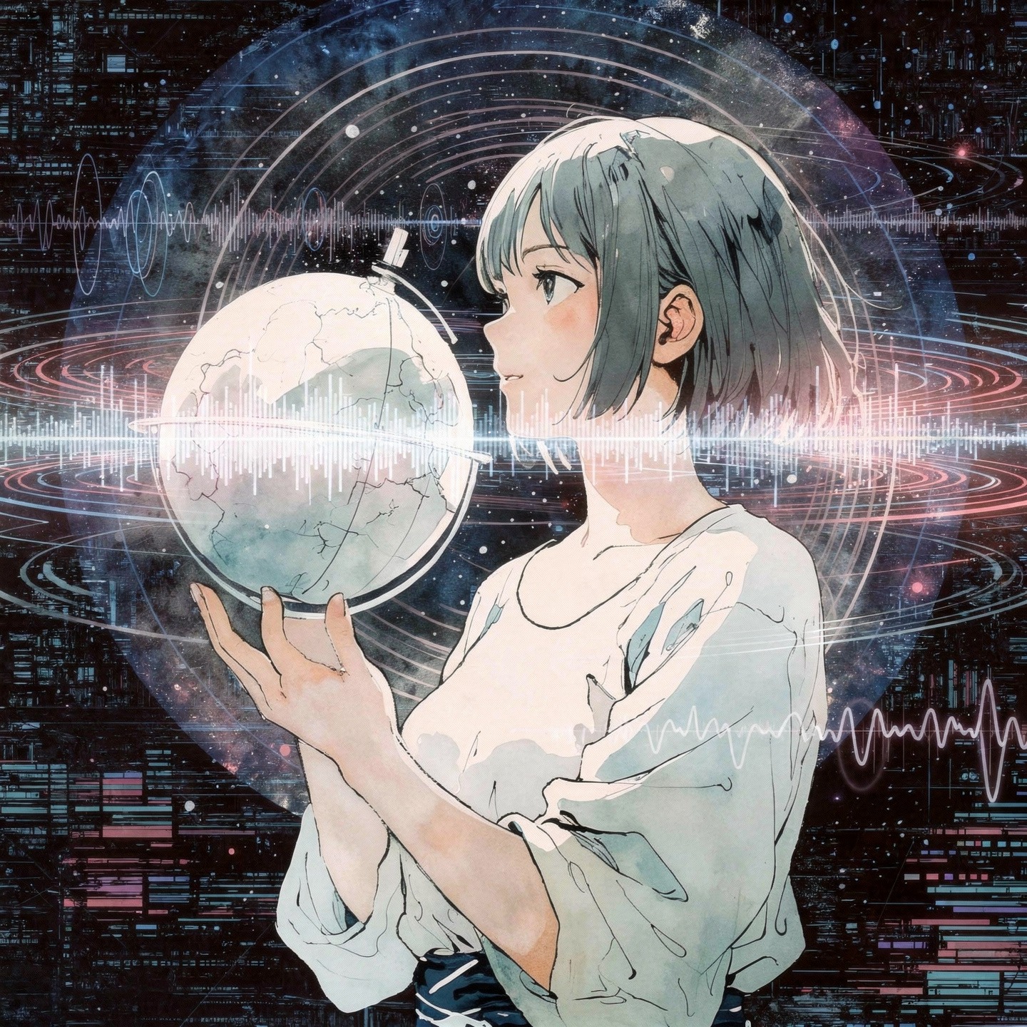Warm blue tone, Clear chord movement, emotional fusion, primarily composed of Lo-fi Hip Hop and Chillwave (approx, 60%), with a strong influence of cinematic Romance Techno and 90s Japanese Technopop (approx, 40%), The track captures the bittersweet, gentle feeling of a woman observing her partner absorbed in his smartphone, The track is driven by a slow, dusty, boom-bap style hip hop beat, The low end is a deep, warm sub-bass that feels like a gentle heartbeat, The core harmony is centered around warm, Fender Rhodes-style electric piano chords and gentle, clean electric guitar licks, The chorus is defined by a breathtakingly beautiful, unforgettable, and soaring vocal melody, This melody is supported by a lush, layered, and ethereal gospel choir that provides atmospheric background harmonies, creating a moment of cathartic, Floating Chords, Massive Analog Pads, Suspended Chords, Holographic 3D Audio, Binaural, Spatial Mixing, Dream Trance, Emotional