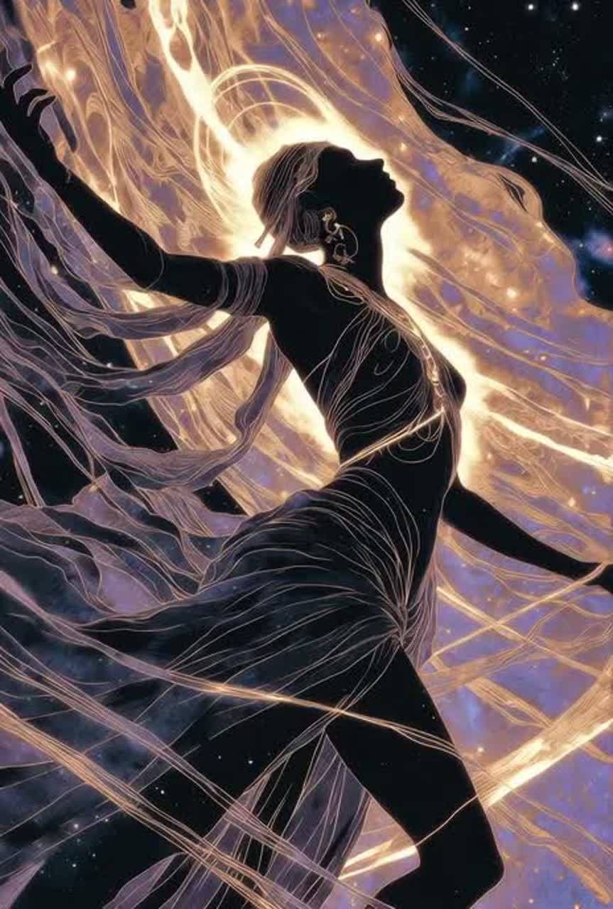 Angelic celestial funk jam, 100 BPM, Percussive harp plucks acting as a funky slap-style bass groove, deep electric bass supporting the rhythm, Golden trumpet and trombone section playing bright shimmering syncopated funk riffs and stabs, Floating soulful drum groove with deep kick, crisp snare and airy percussion, Multi-dimensional vocal harmonies layered like a celestial choir with expressive female lead, Sparkling cosmic synth textures and shimmering ambience, Mood uplifting, ecstatic, radiant and spiritual, Cinematic otherworldly funk energy, immersive groove, warm analog tone, wide stereo image