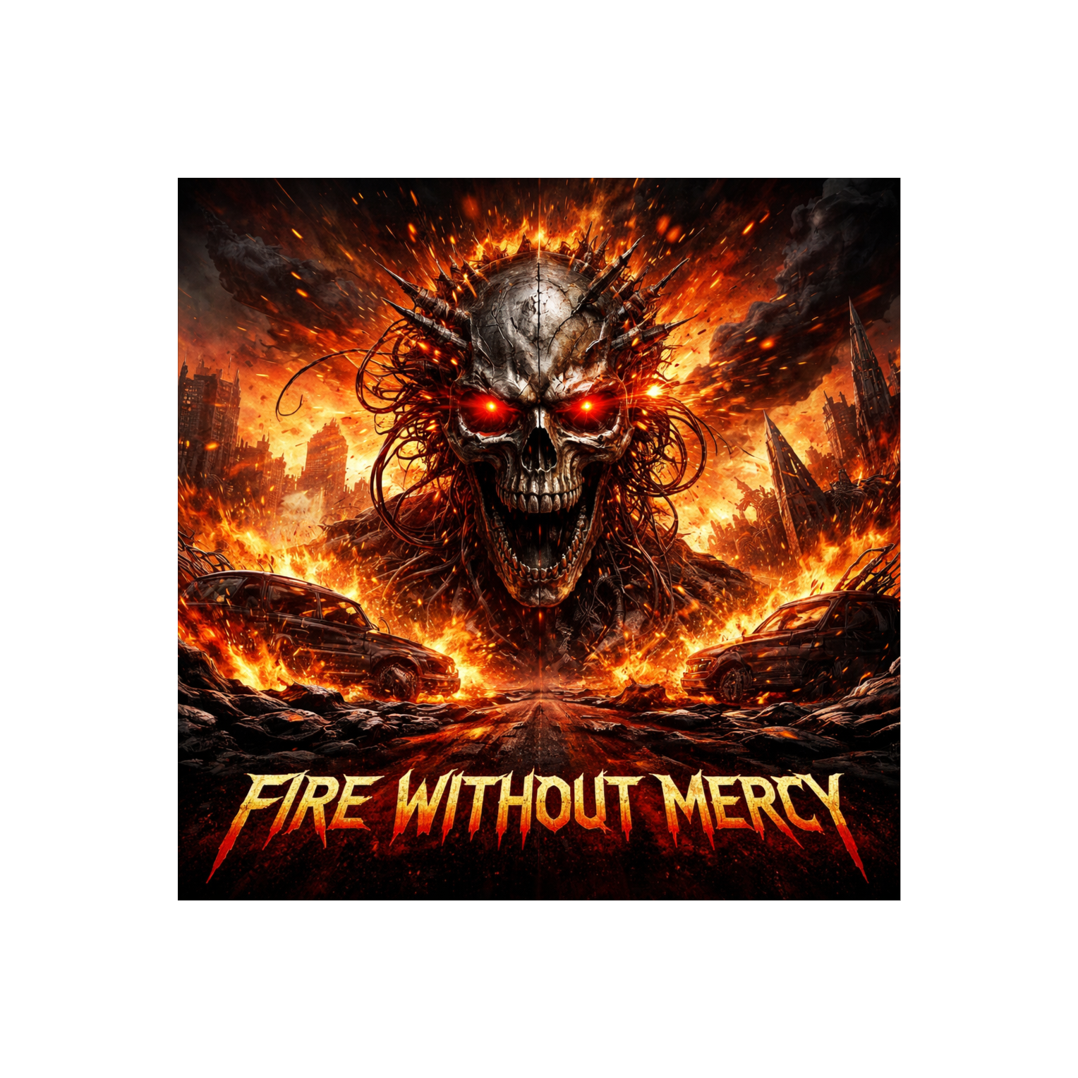 Genre: Early thrash metal, Vocals: Fast barked male vocals used sparingly as rhythmic accents, Clipped phrasing locked to guitar picking, Dry mid-range rasp, No melody, no sustain, no effects, Vocals sit slightly behind guitars and bass, Tempo: Fast and relentless, driven by string attack rather than percussion, Instrumentation: Two distorted electric guitars hard-panned left and right with aggressive palm-muted riffs, tremolo picking, and sharp alternate runs, One lead guitar for solos, Electric bass centered, overdriven, and highly present as the rhythmic engine, Feel: Urgent, dangerous, constantly moving, Momentum created through picking intensity and tight synchronization, Arrangement: Riff-driven, Long continuous sections, No breakdowns, Multiple lead sections, Abrupt ending, Mix: Dry and exposed, Guitars biting and mid-forward, Bass loud and articulate, Minimal reverb, Raw analog character