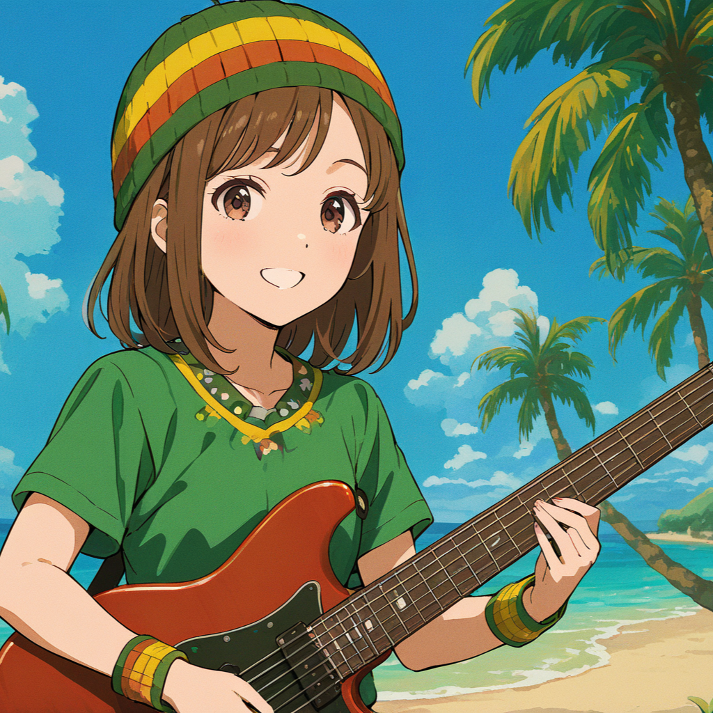 Reggae Pop, Bright, intricate guitar tapping weaves complex, shifting time signatures over tight, Lush synth pads fill out the harmonic space, while bubbly kawaii pop textures and glitched samples add sparkle, Cheerful female vocals glide atop, balancing the progressive rock fusion with catchy, playful melodies